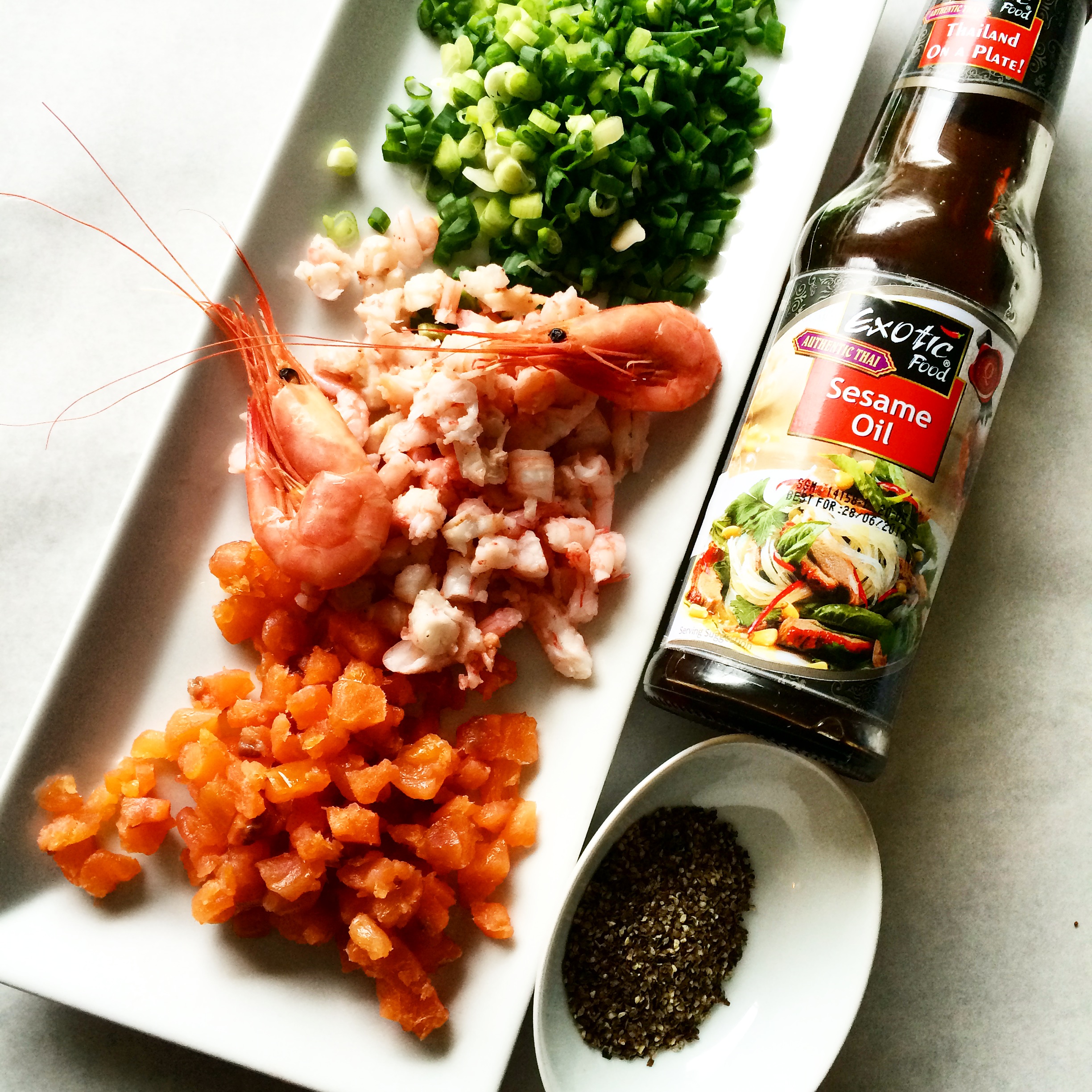 Pensle med 1 spiseskje sesamolje og strø over de finhakkede rekene, halvparten av laksen og vårløken. Kverne over litt pepper.