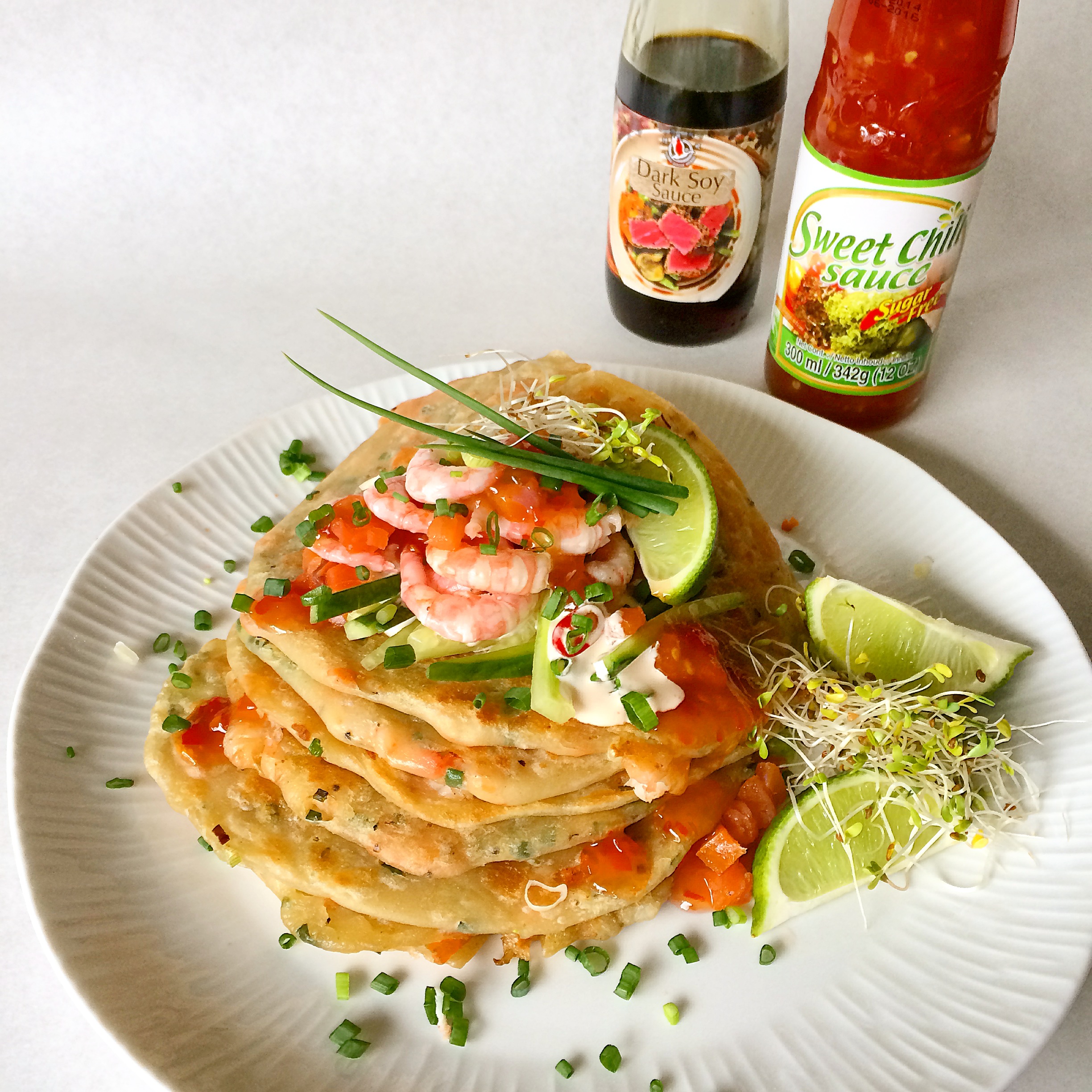 De stekes som vanlige pannekaker i panna og serveres med sweet chili, soya sause og en lett salat.