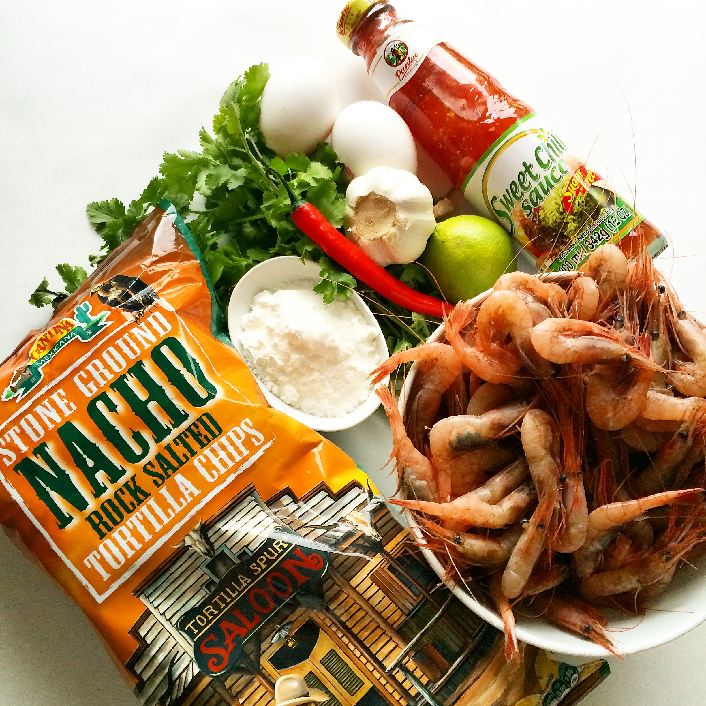 Reker med smak av chili, hvitløk og koriander servert på salte nachos med en deilig sweet chili saus å dippe i.