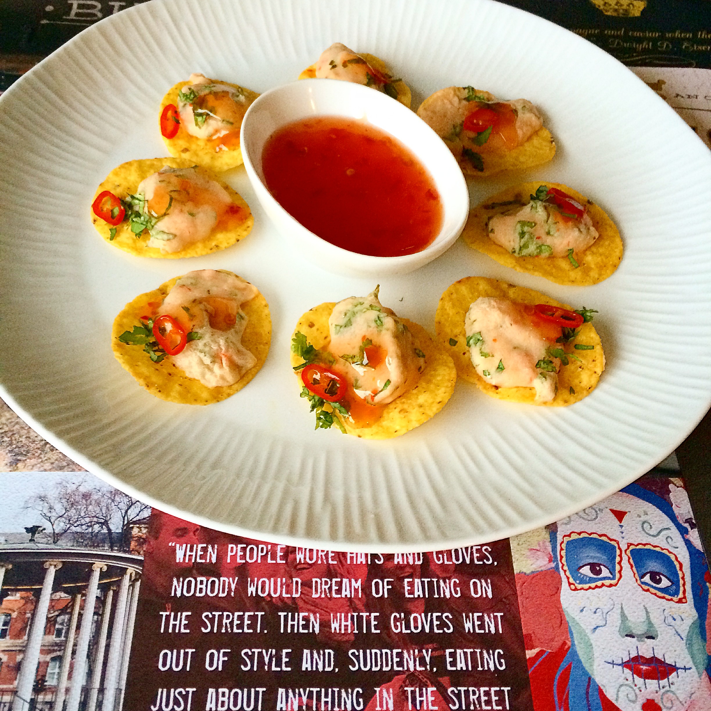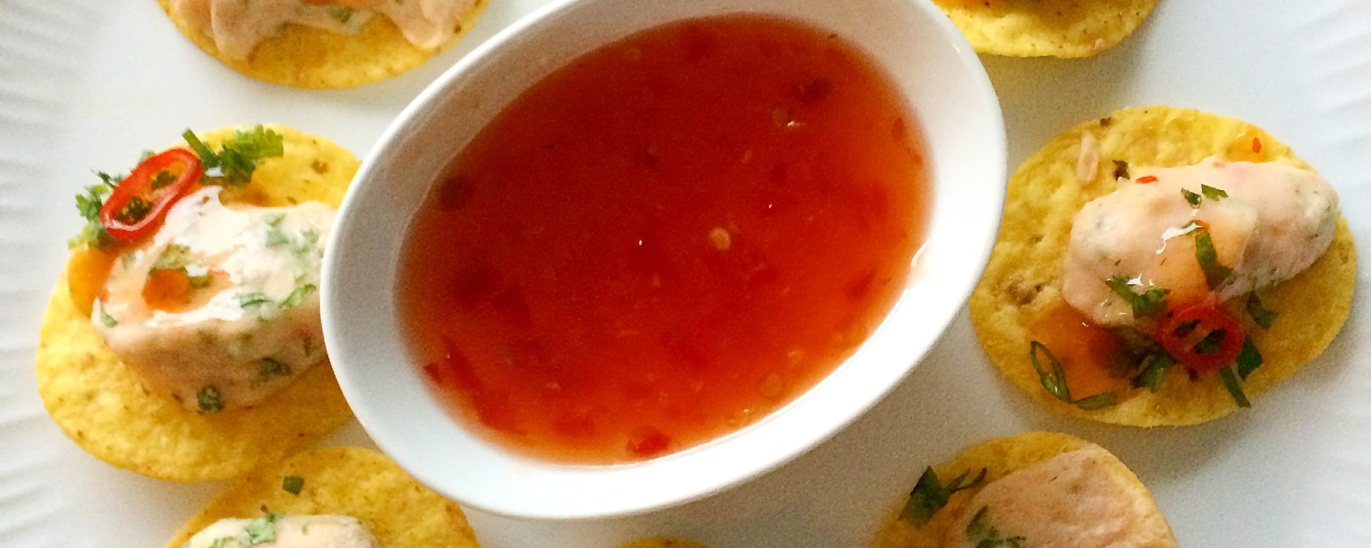 Jeg strødde litt finhakket koriander over og dryppet litt sweet chili på hver rekechips. I tillegg serverte jeg med en sweet chili saus du kan dyppe i.