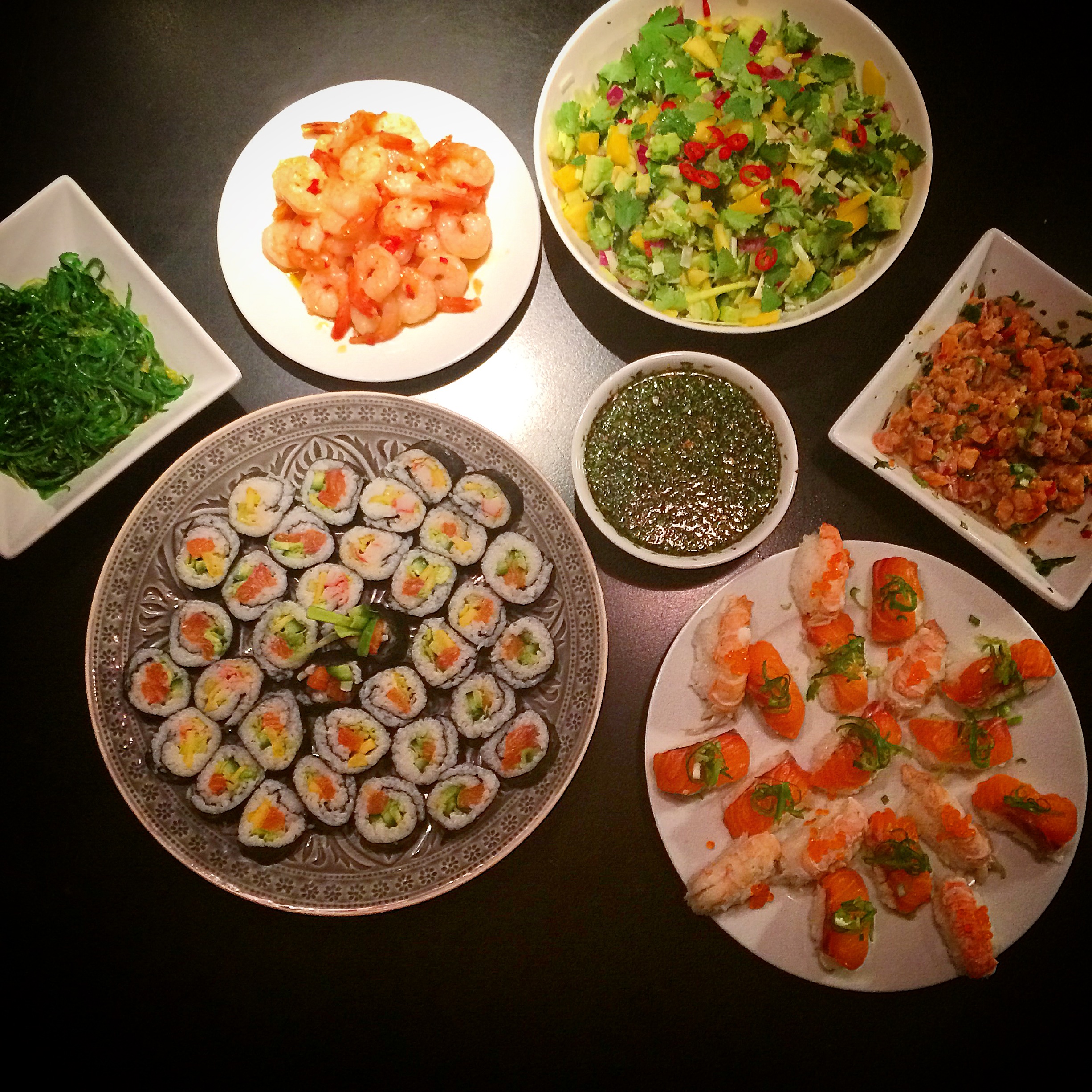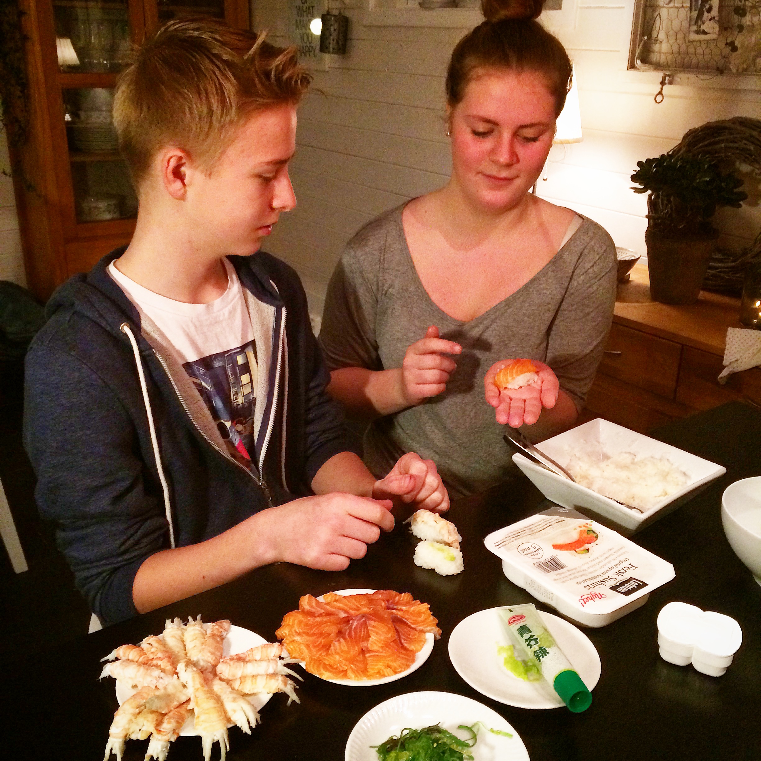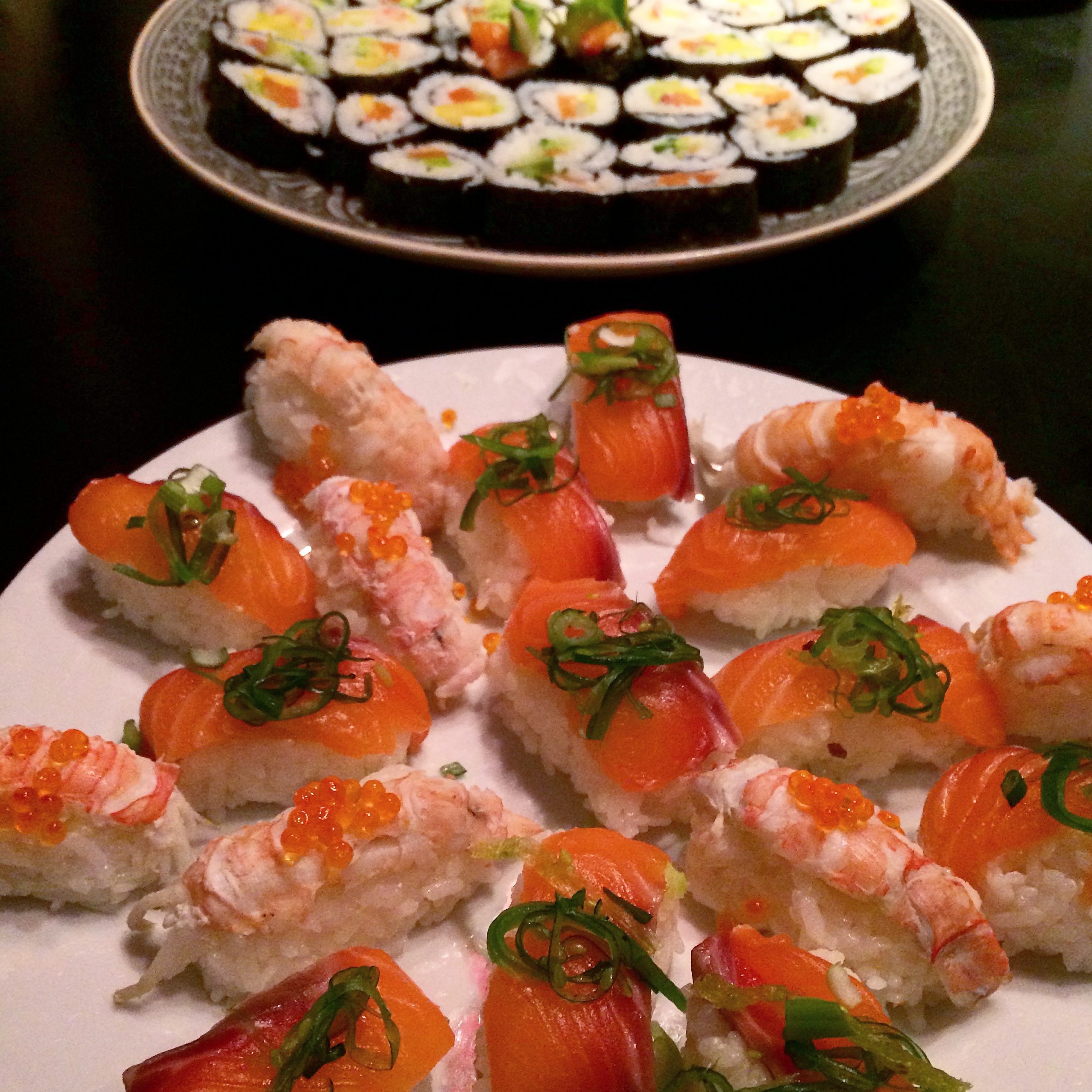 Vi samlet familien og lagde en hyggelig sushikveld ut av det og rullet i tillegg maki og lagde alt tilbehøret selv. For de fleste var dette aller første gang de lagde sushi og resultatet ble strålende 😀 Er du i tidsklemma lager du bare nigiri, men har du tid har du lov..