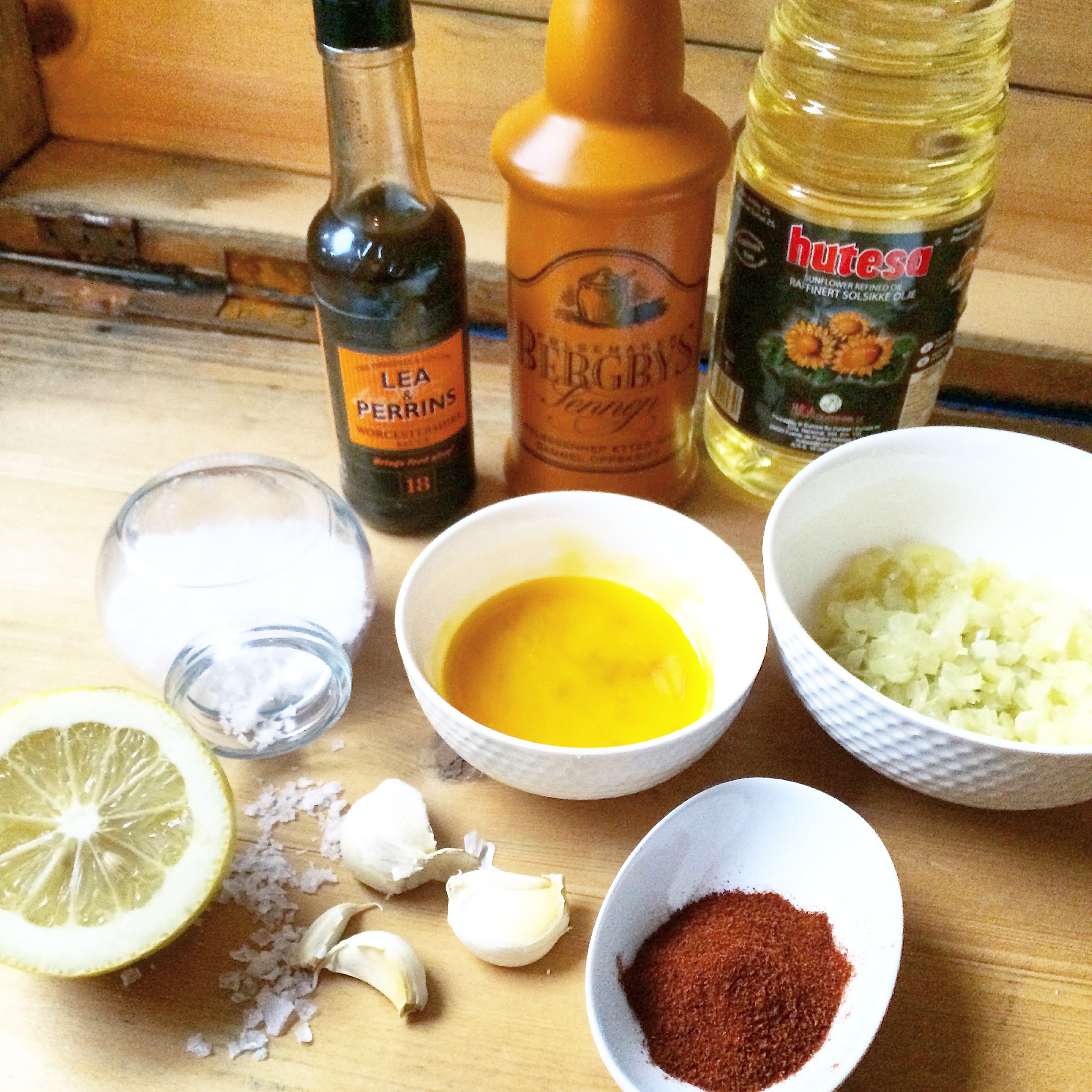 Begynn å finhakke løken og blansjer (bli gul og gjennomvarm) den lett i en stekepanne med litt smør. Ha den over i en høy beholder sammen med eggeplommer og alle ingrediensene foruten om oljen. Rør det godt sammen med en mixer/blender.