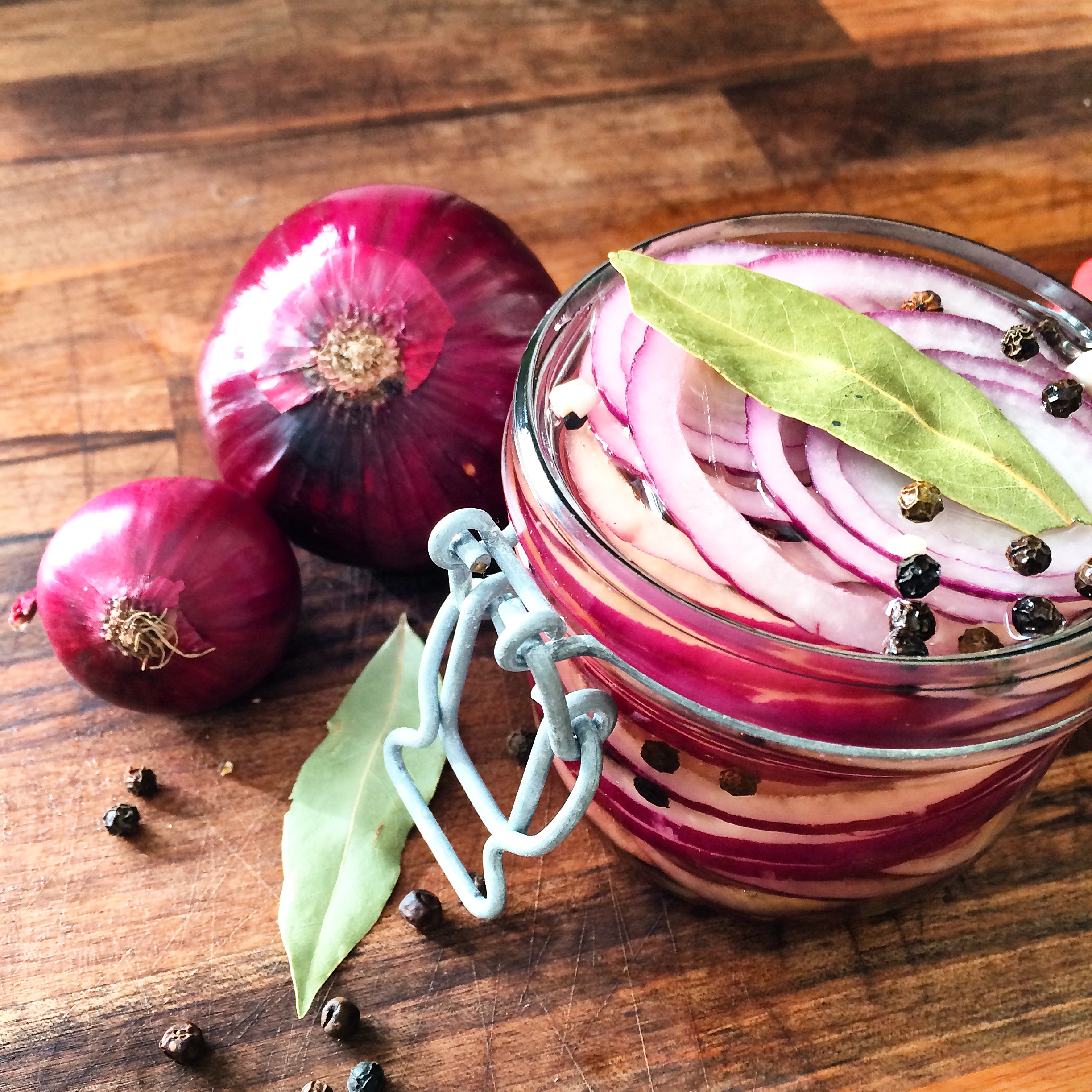Kok opp eddik, sukrin og salt. La avkjøles. Skjær rødløken i tynne skiver o legg på et glass. Ha noen hele svarte pepper og chiliflak innimellom og hell over laken. Løken smaker best når den har fått rukket i laken en stund så lag den gjerne dagen før. For ekstra smak kan du ha oppi en stjerneanis og noen nellikspiker.