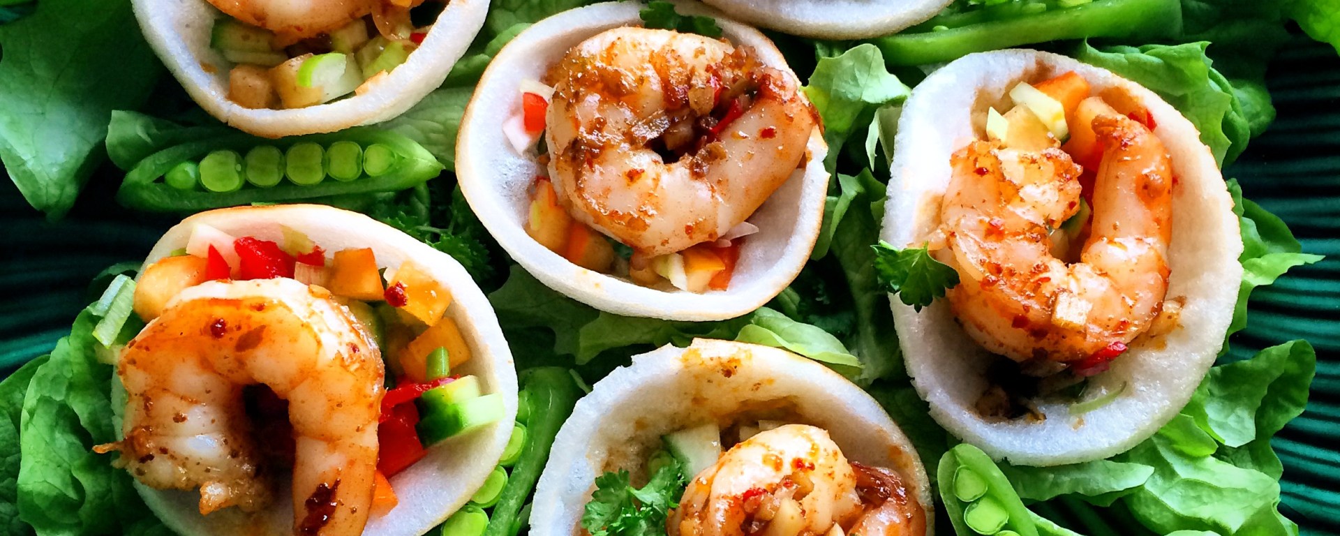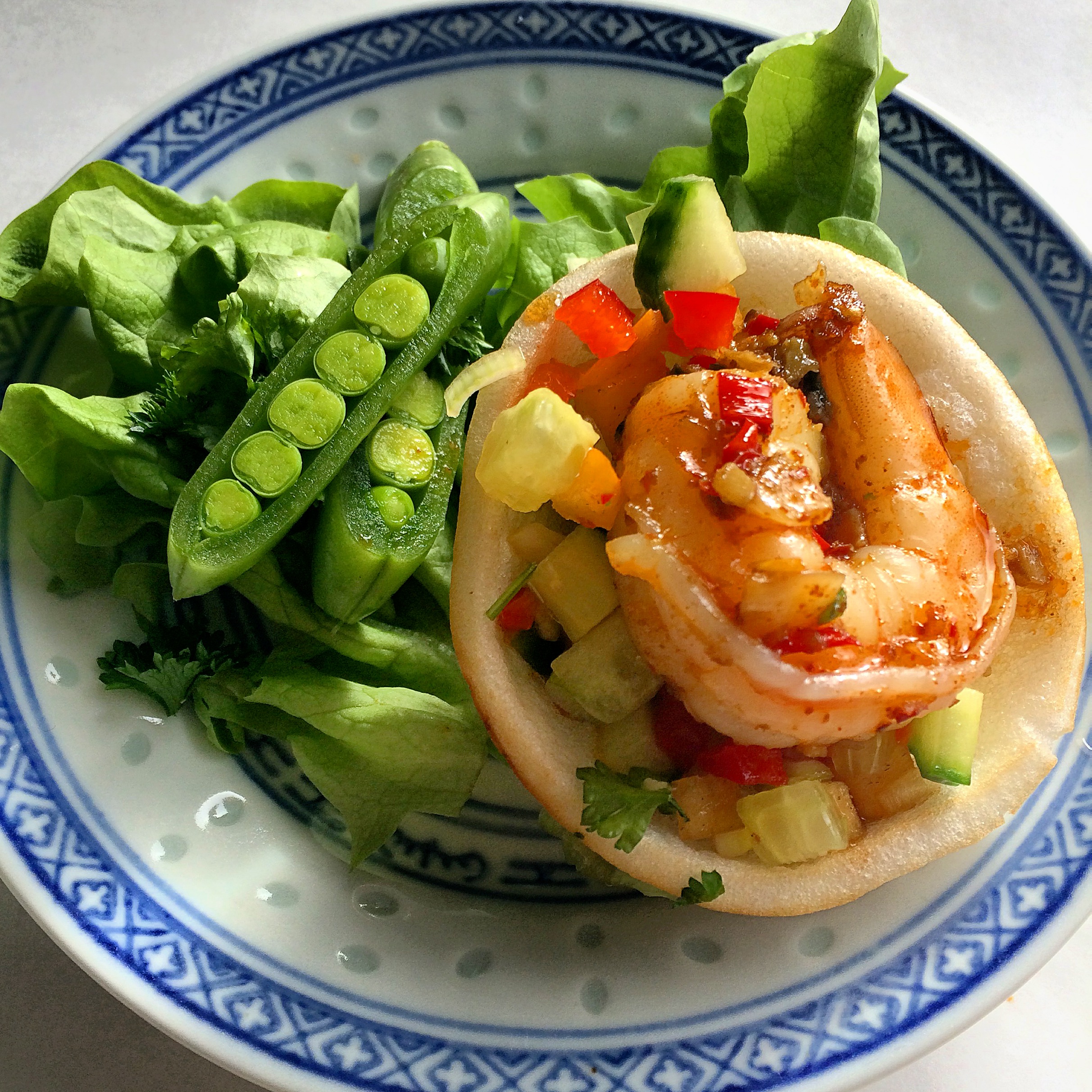 Fyll rekechipsene med litt salat og legg en scampi oppi hver chips. Strø gjerne litt finhakket persille over. Server med en enkel salat til eller også ris. Jeg toppet med noen dråper god soyasaus også.