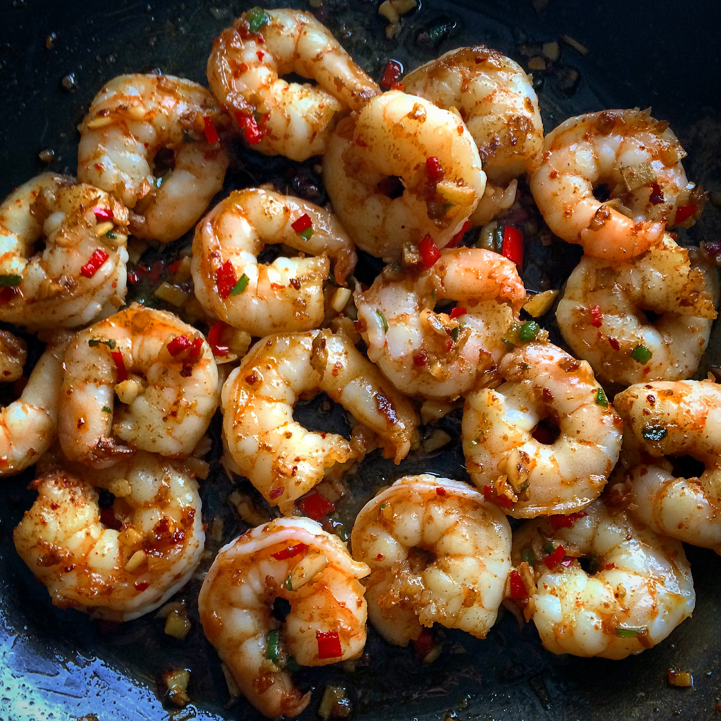Dette er scampi stekt i frisk chili, hvitløk, ingefær og harissa krydder servert i sprø rekeschips med finhakket frisk salat. Her får du en stor smaksopplevelse i hver munnfull!