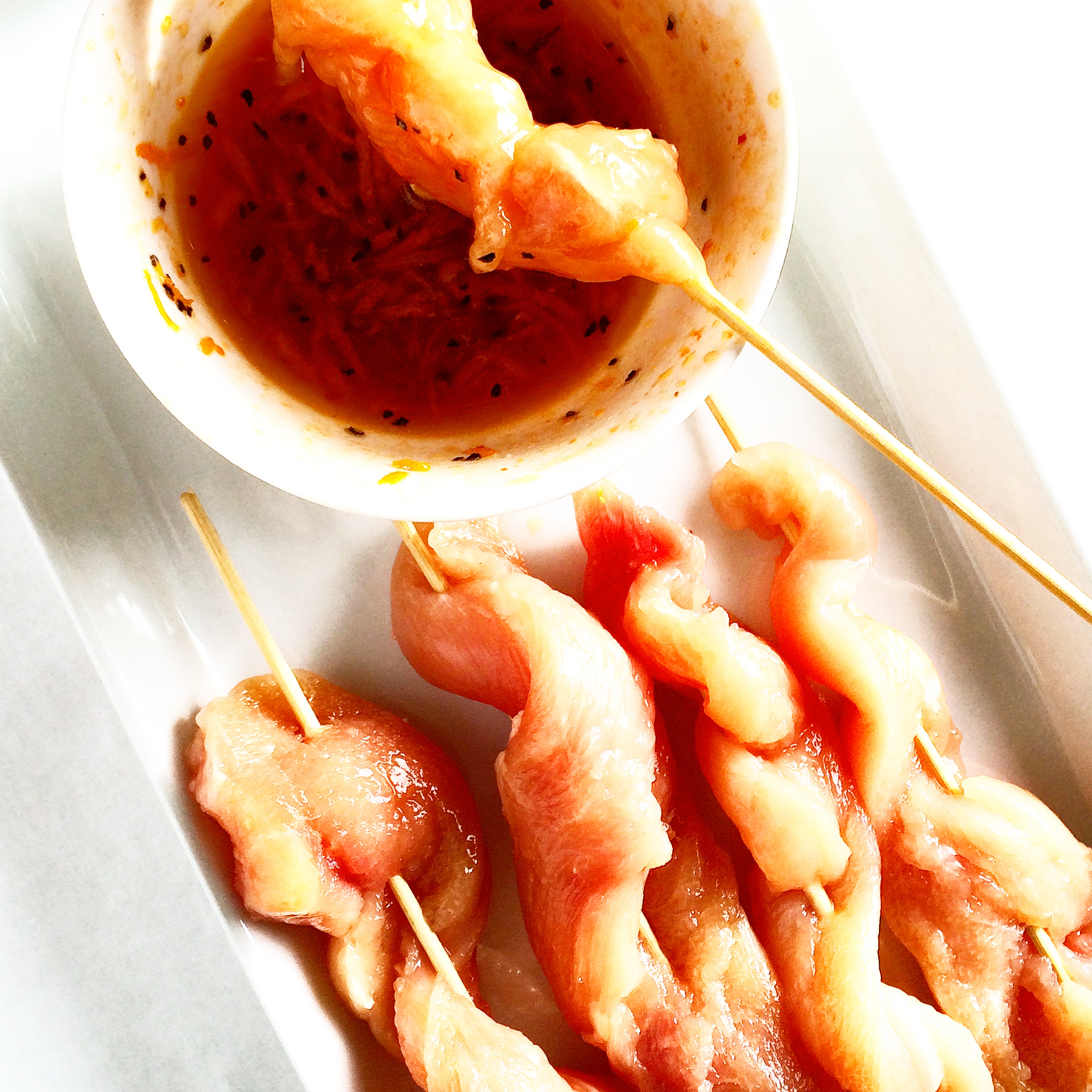 Skjær kyllingfileten i 3 lange strimler og trè på grillspyd.
