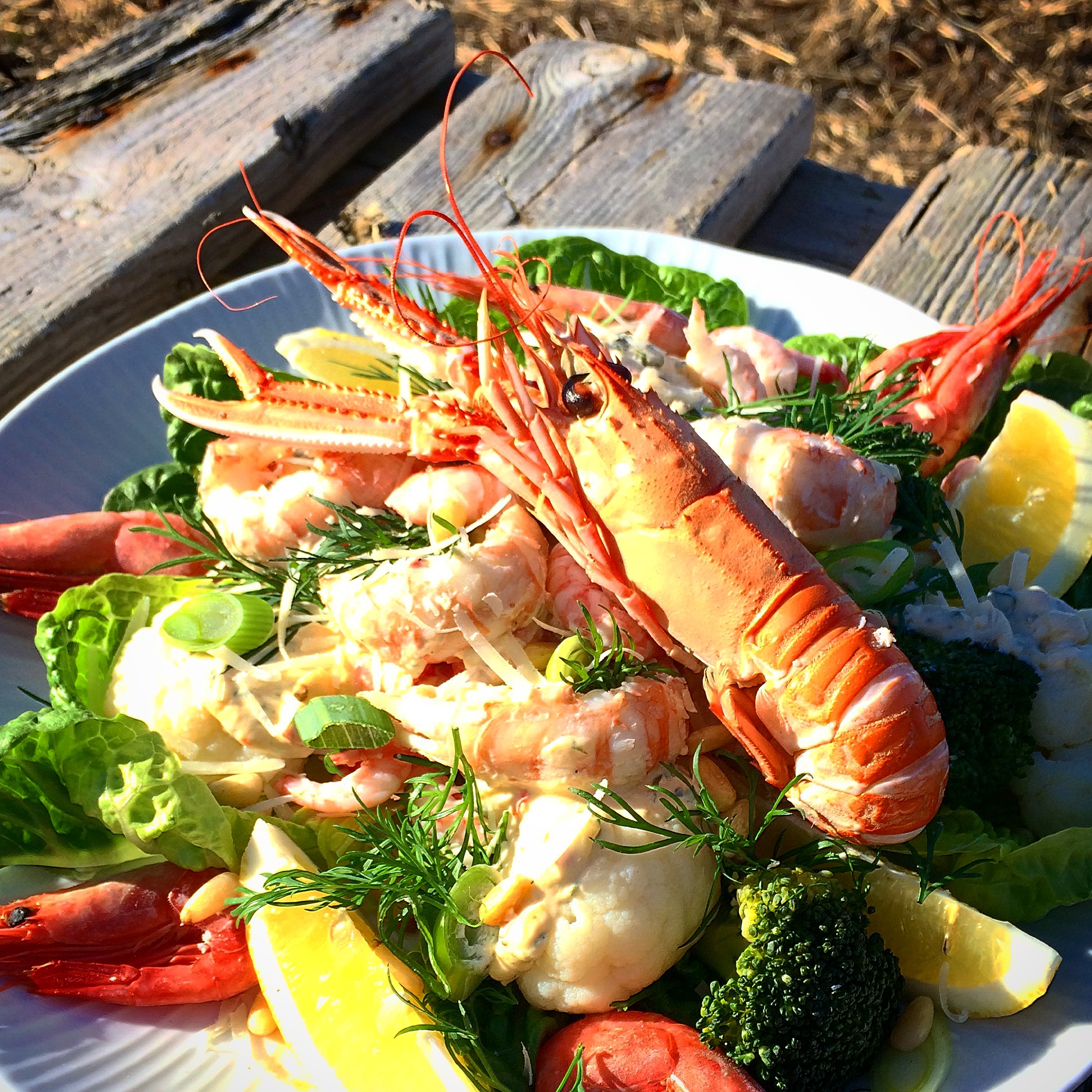Salaten er enkel med blomkål, brokkoli og salatblader toppet med ferske Gundereker fra Son og sjøkreps. Det er den gode parmesansausen med hvitløk, chili, urter og fløte som overrasker og gjør denne salaten eksepsjonelt god.