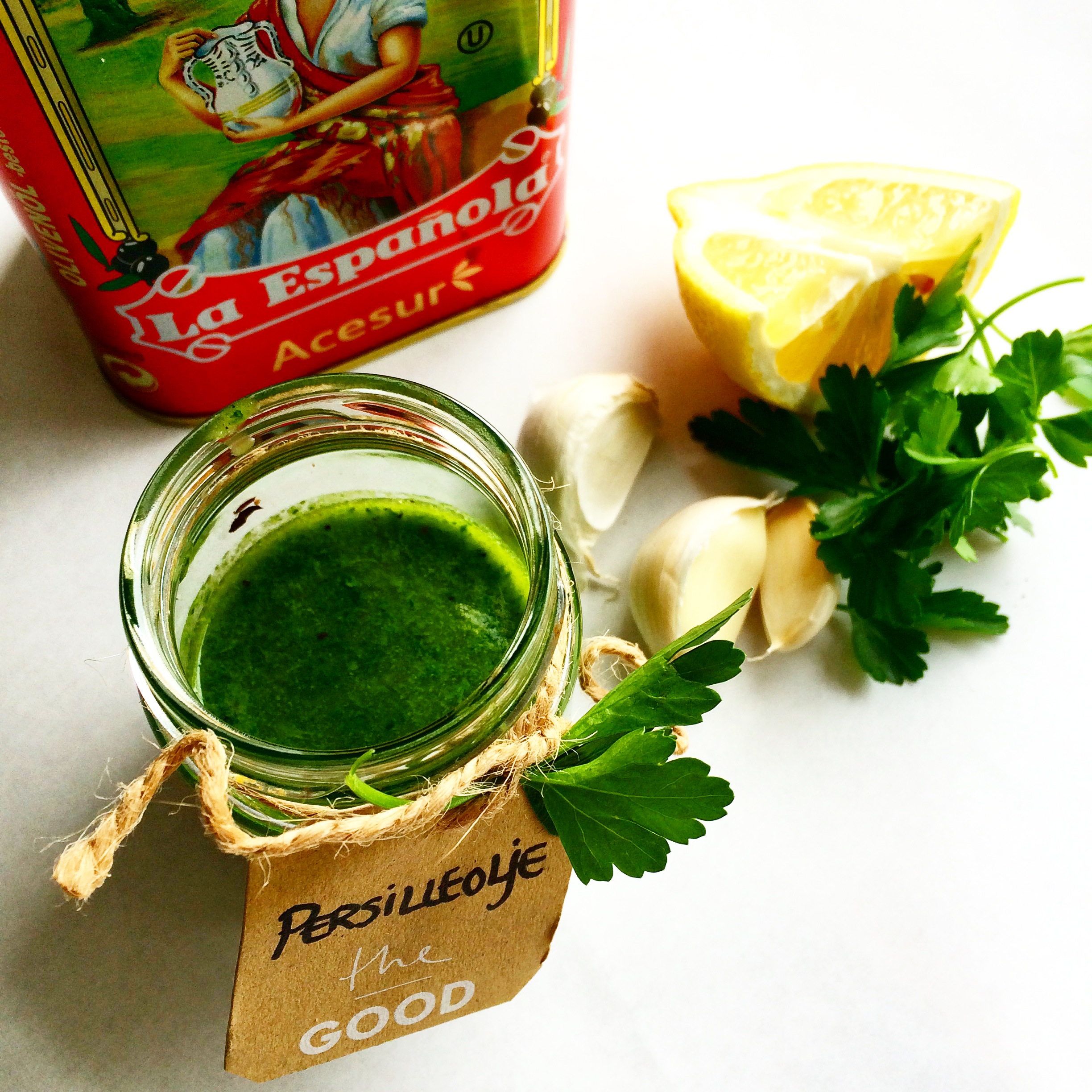 Lag persilleoljen ved å ha 1-2 never frisk persille, gjerne bladpersille, i en blender sammen med et finhakket hvitløksfedd, salt og pepper, en skvis sitronsaft og 0.5 del god olivenolje. Miks det godt sammen med stavmikseren i ca 1 minutt. Persilleolje er godt å steke stort sett all slags fisk i eller å bruke som dressing.