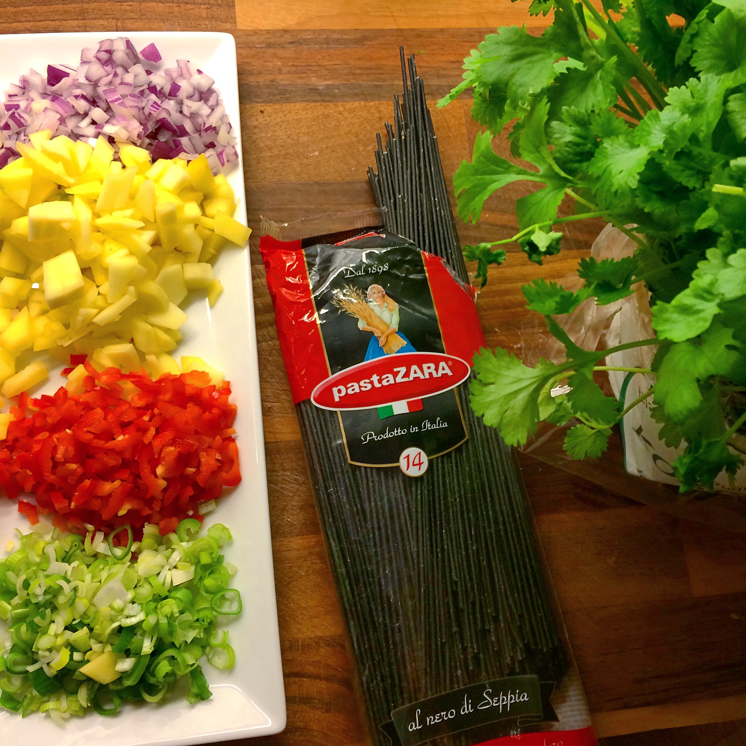 Jeg hadde egentlig mest lyst til å prøve denne spagettien på grunn av den svarte fargen fra blekksprutblekk, men ble gledelig overrasket over smaken. Durumhvete spagettien var fast og fin i formen og hadde en litt salt smak. Den passet strålende til scampi stekt i friske urter og harissa sammen med søt mango, paprika og frisk koriander.