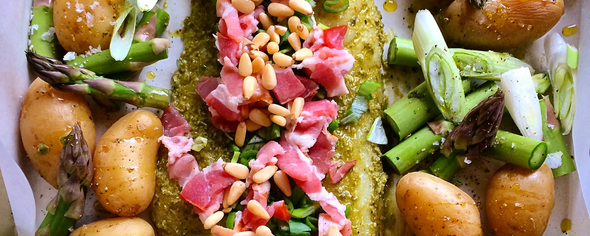 Alt som kan legges i form og stekes i ovnen er genialt! Det er enkel tilberedning og tidsbesparende. Den nøytrale torskefileten går godt sammen med det meste av tilbehør så jeg valgte å bruke pesto med en frisk smak av basilikum, toppe med salt bacon og bakes i ovnen med poteter og asparges. Bildet er fra før den har vært i ovnen.