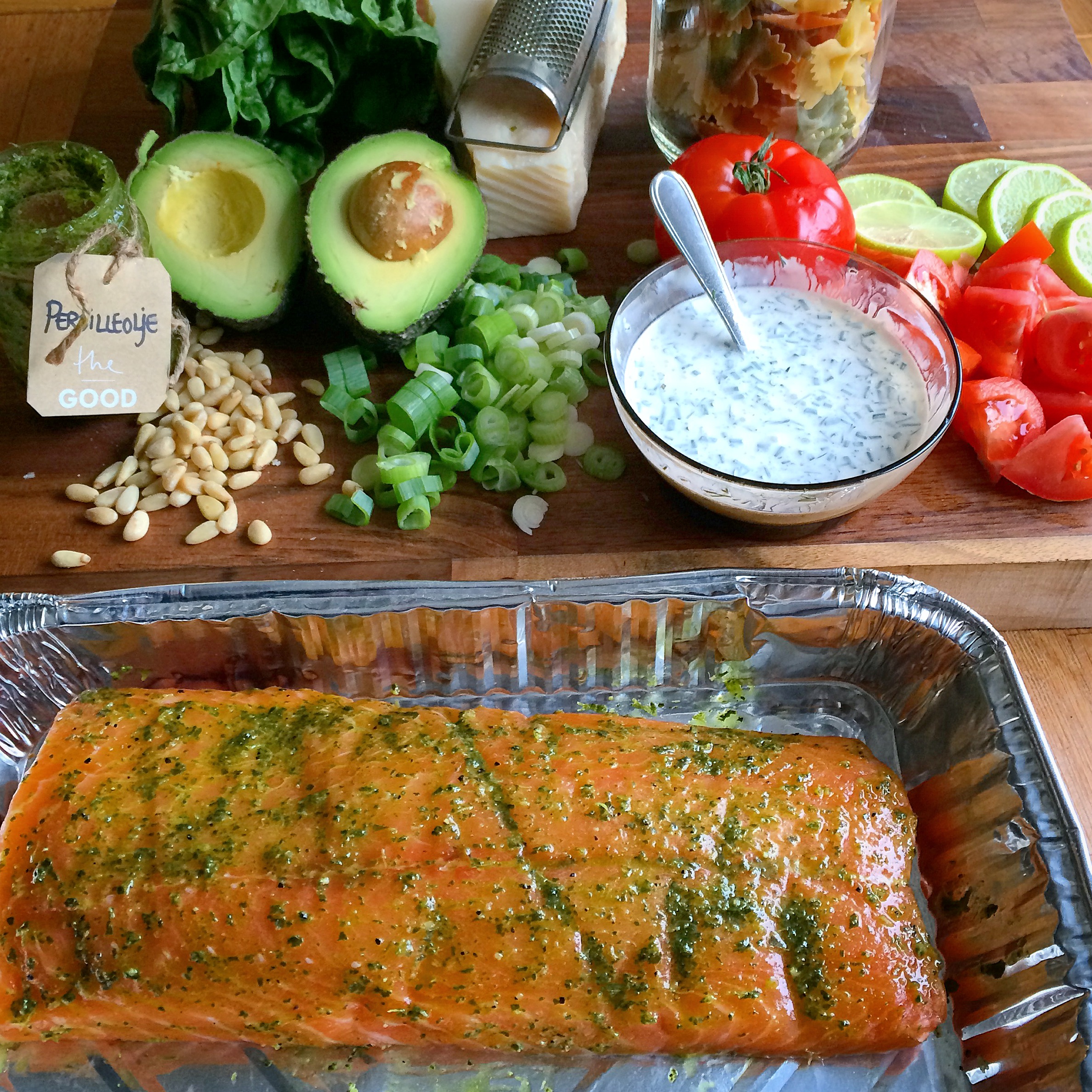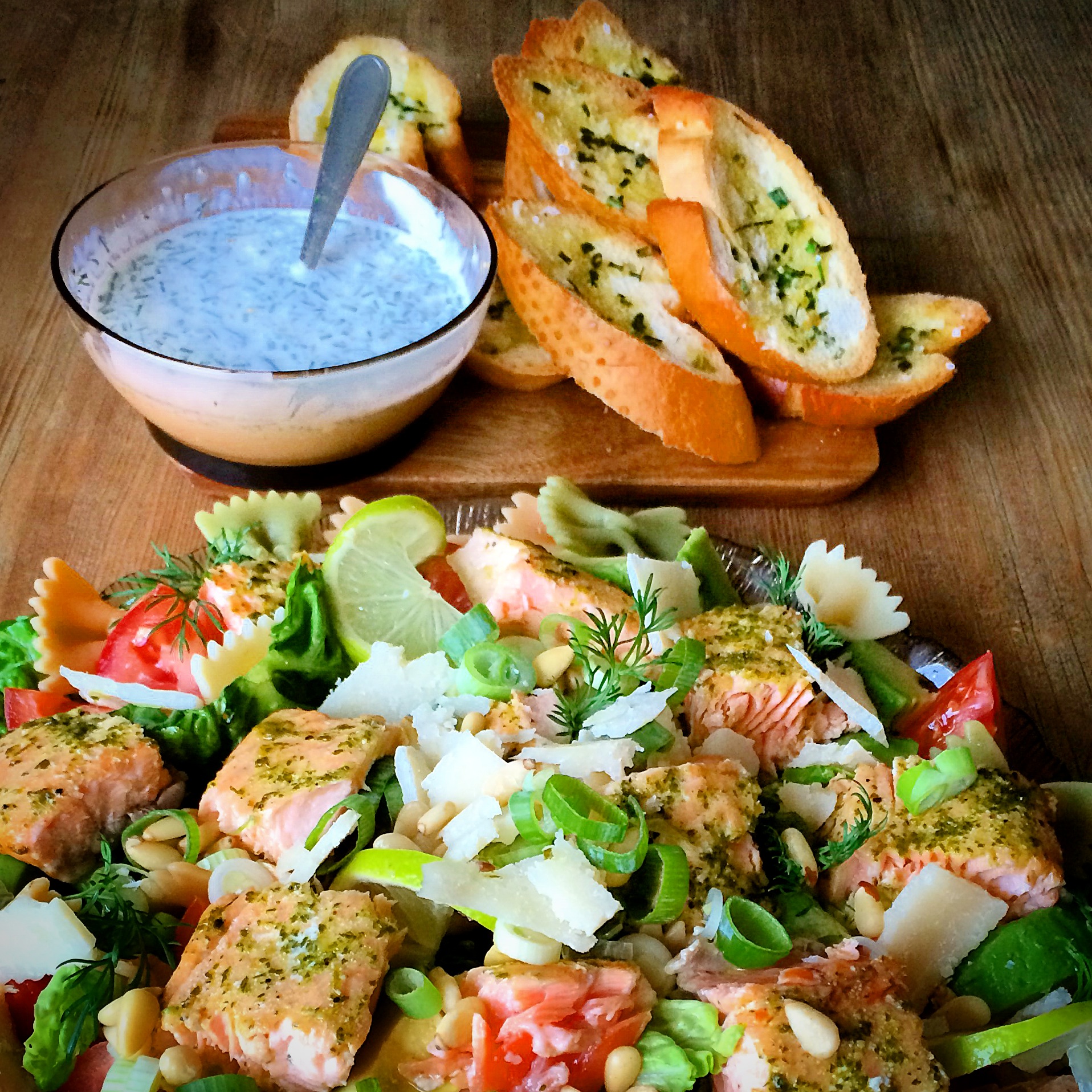 Denne laksen er kun stekt lett i ovnen med persilleolje og servert med frisk salat, pasta, rømmedressing og brød.