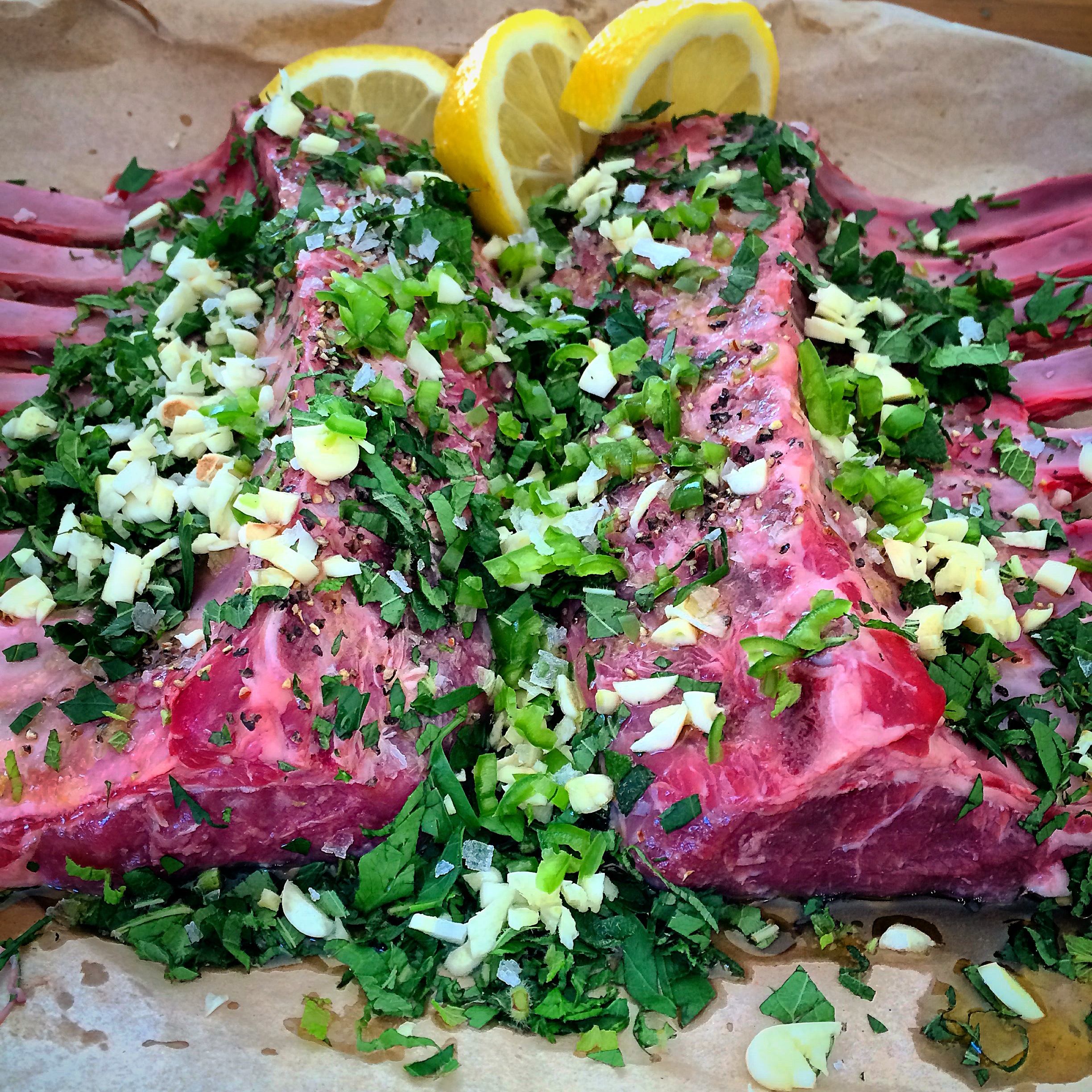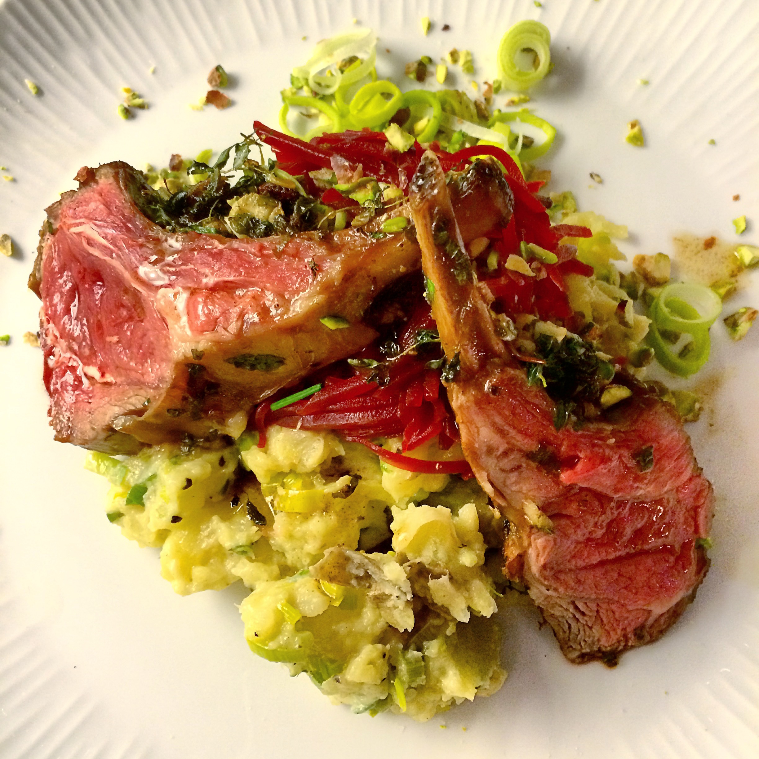 Friske urter av timian, mynte, persille, hvitløk og chili gir dette lammekjøttet en deilig smak av påske! Brun lammekareen raskt i stekepanna før du tilbereder kjøttet medium stekt i ovnen på lav varme. Slik får du en sprø stekeskorpe, et saftig innhold og beholder friskheten på urtene. Kjøttet smakte himmelsk i seg selv så jeg lagde en snadder grovmost potetstappe med blansjert purre og serverte kun rødbetsalat til.