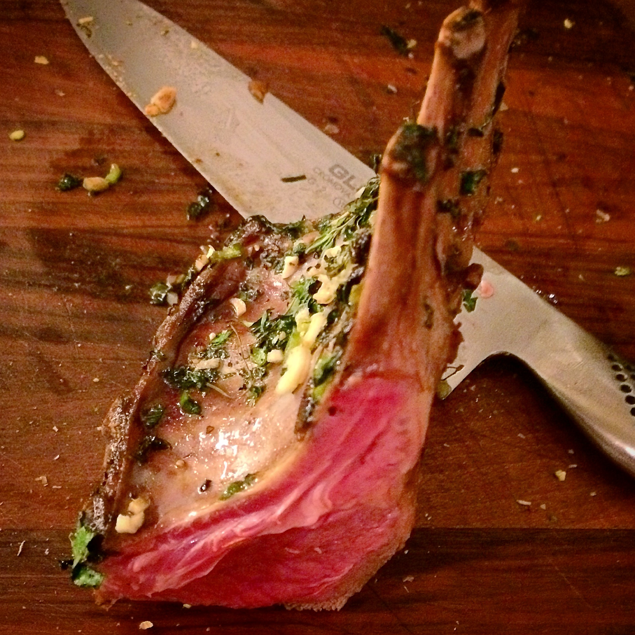 La kjøttet hvile under folie i minst 5 minutter før du skjærer karreen i koteletter.