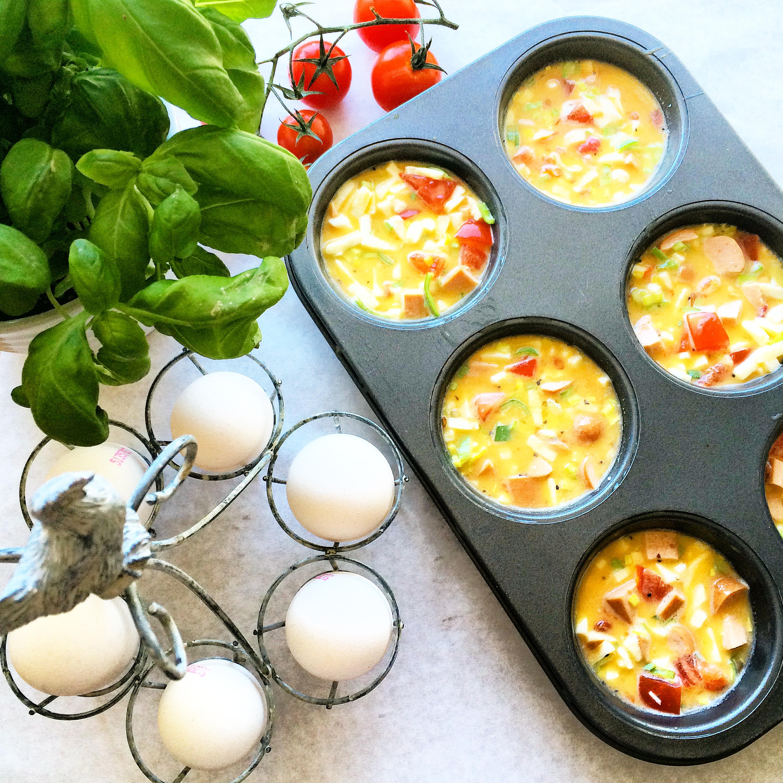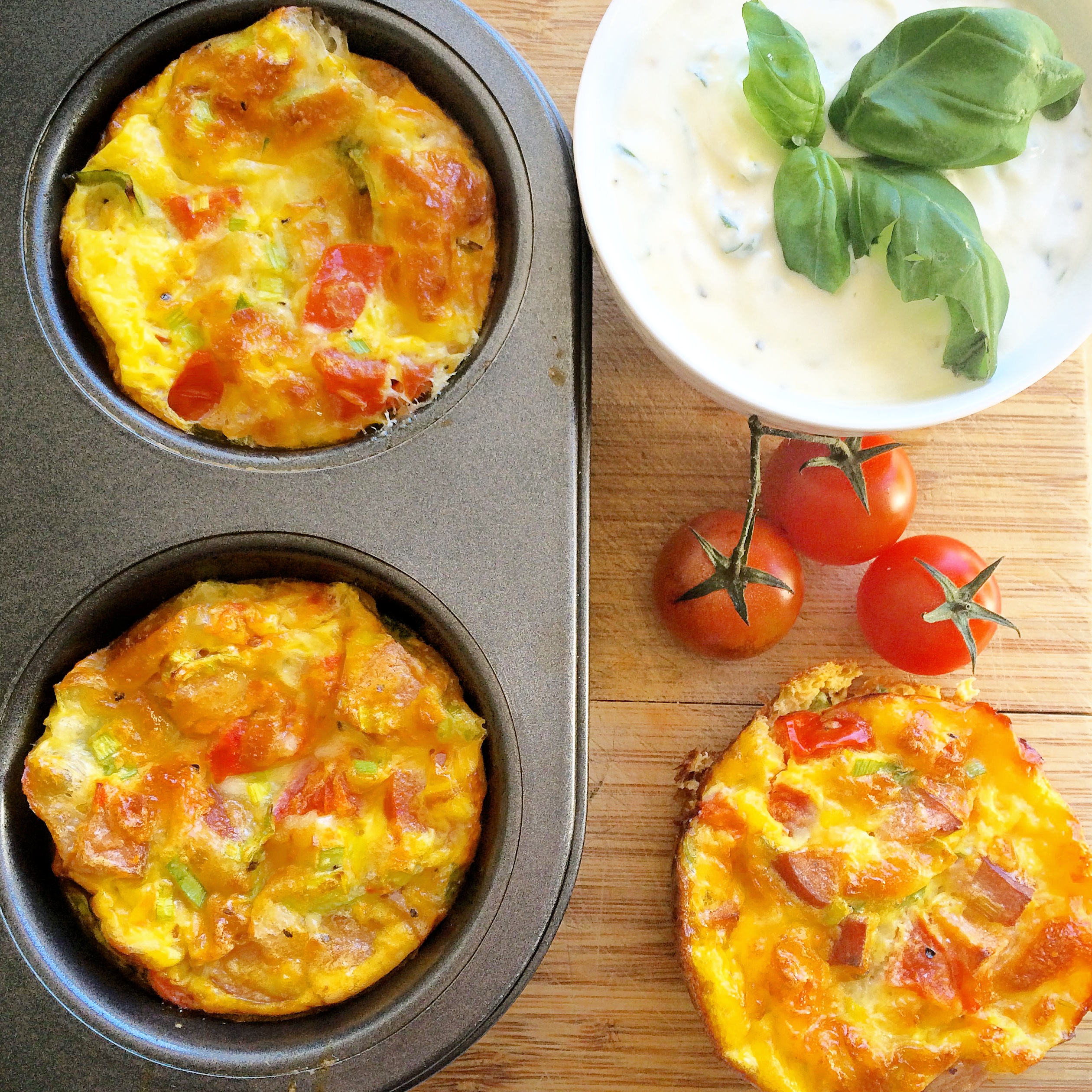 Disse porsjonsomelettene har jeg blogget før, men dette er en litt annen variant og passer perfekt i påsken! Mange har vært ute og grillet i det nydelige påskeværet og kanskje har du ett par pølser liggende i kjøleskapet. Sammen med egg, tomat, purreløk og ost blir disse små omelettene både mettende og gode. Ta det du har og bland sammen en omelettrøre som du steker i muffinsformer.