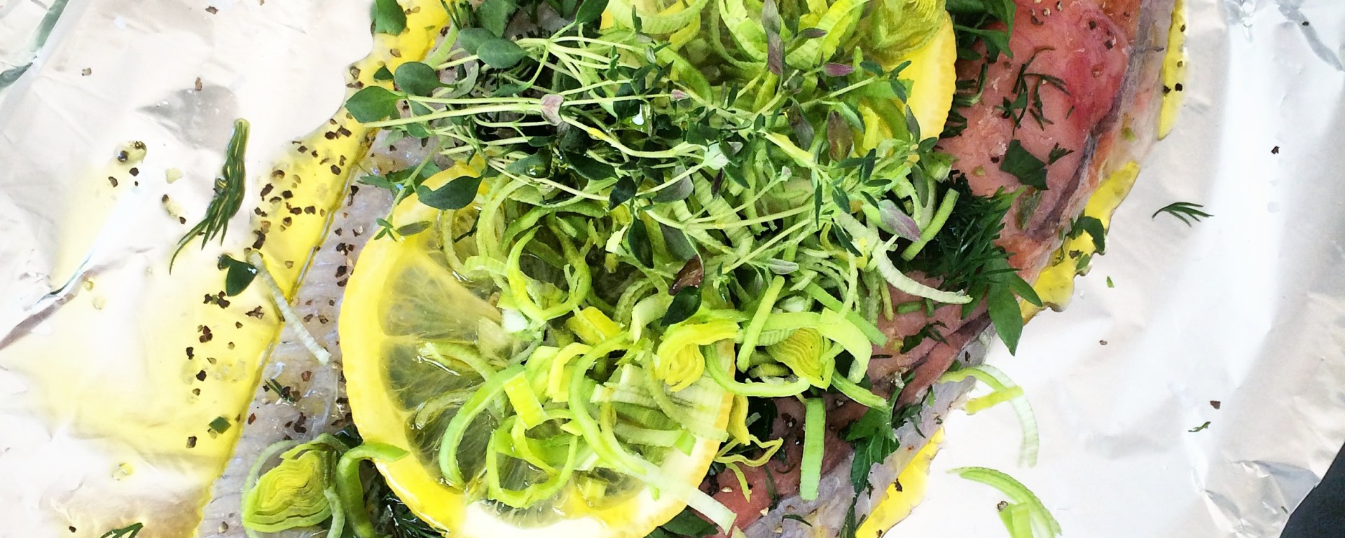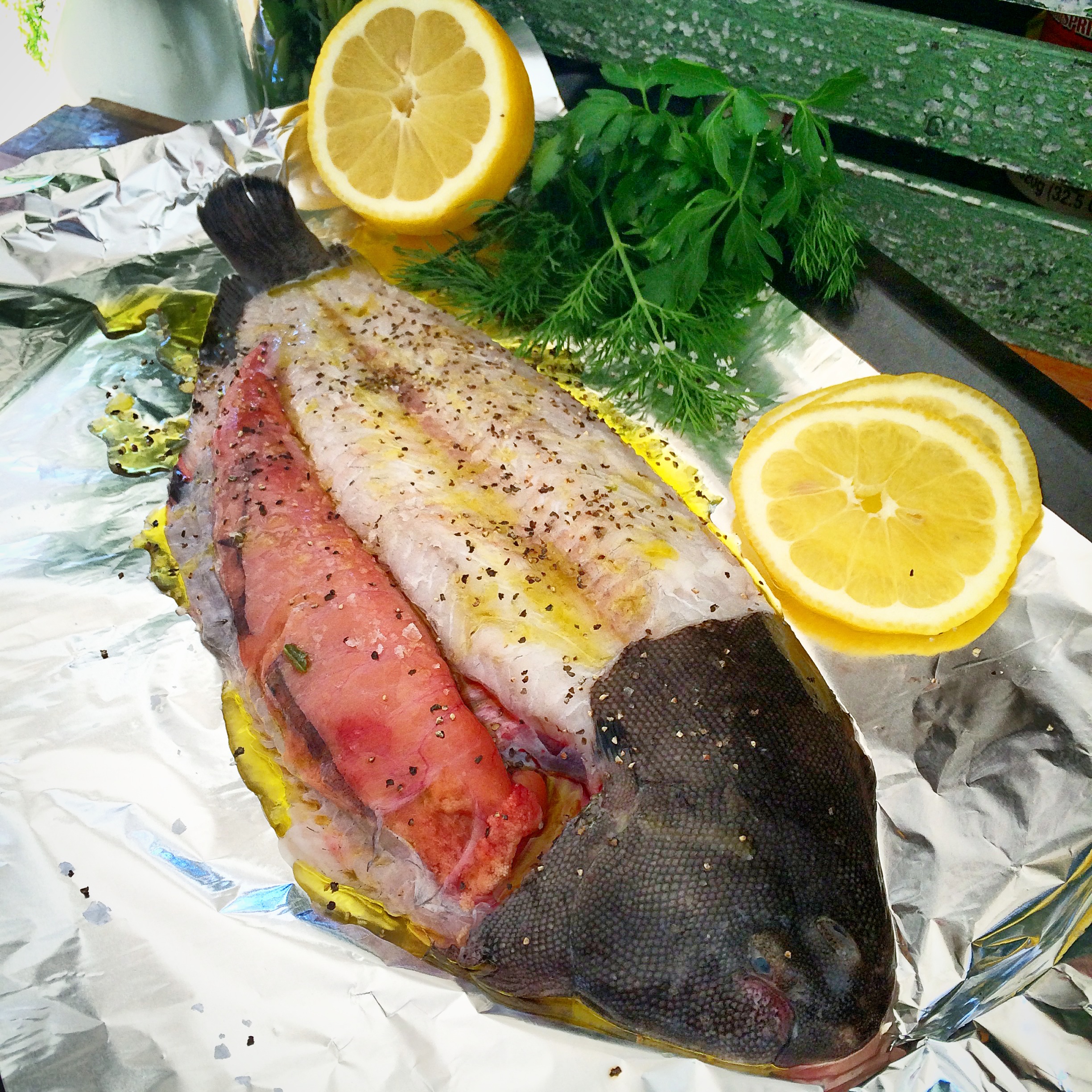 Legg fisken på et stekebrett. Skvis over saften fra en halv sitron og hell over en god olivenolje. Salte og pepre og topp med lit finhakkede urter. Hvis du ønsker kan du ha litt aluminiumsfolie over slik at urtene ikke blir stekt, men siden den kun skal i ovnen i 20 minutter på 180 grader synes jeg det gikk fint å steke den åpen.