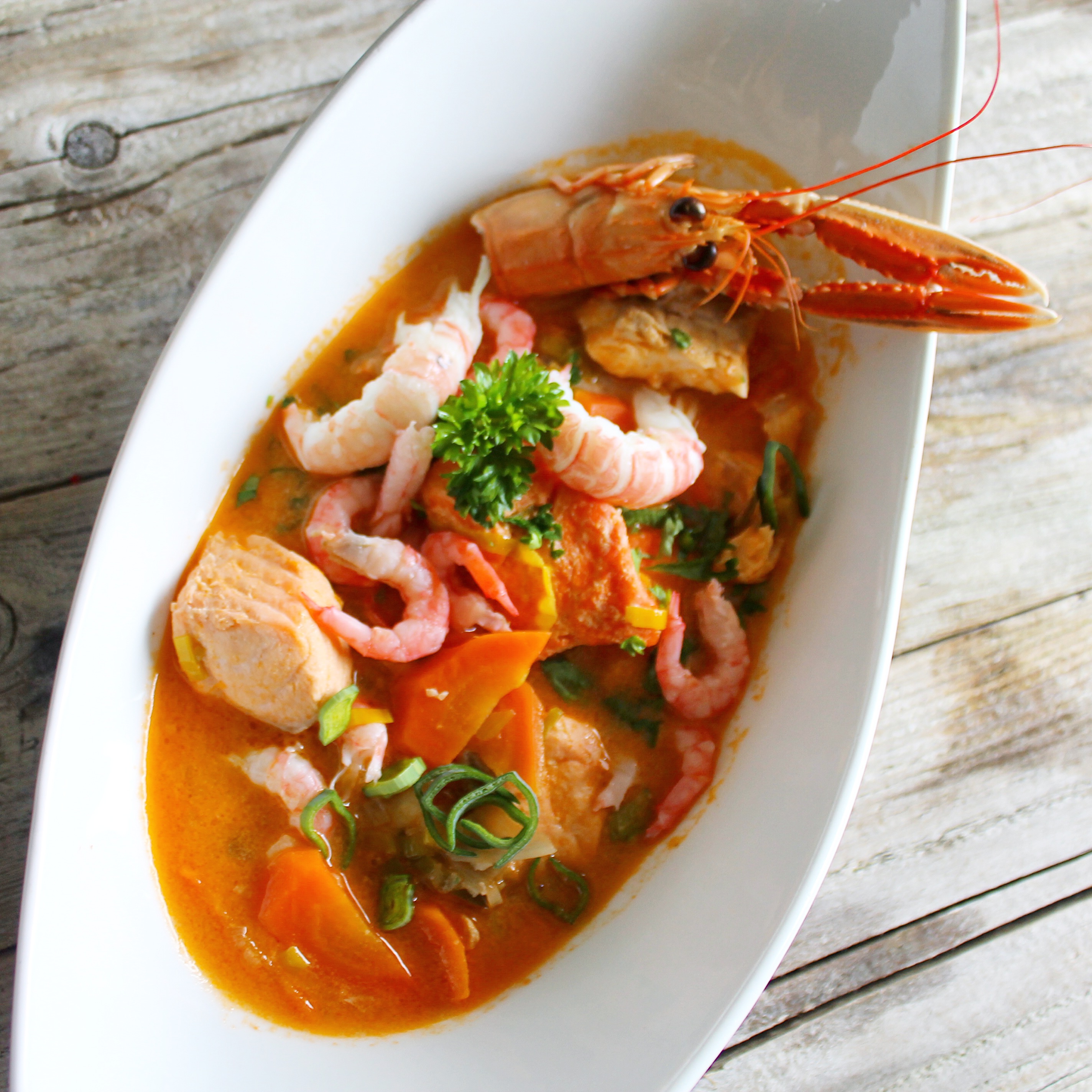 Denne fiskesuppa er bare utrolig smakfull med ulike typer fisk, reker og grønnsaker. Garantert en suppe som kommer til å falle i smak både hos liten og stor.