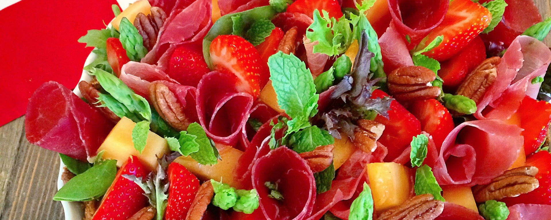 Ta paien ut av ovnen og legg på et godt lag med salatmix. Rull strandaskinke og fenalår i roselignende buketter og fordel jevnt oppå salaten. Pynt med jordbær og honningmelon. Stikk noen aspargestopper innimellom og pynt med pekannøtter og litt mynteblader.