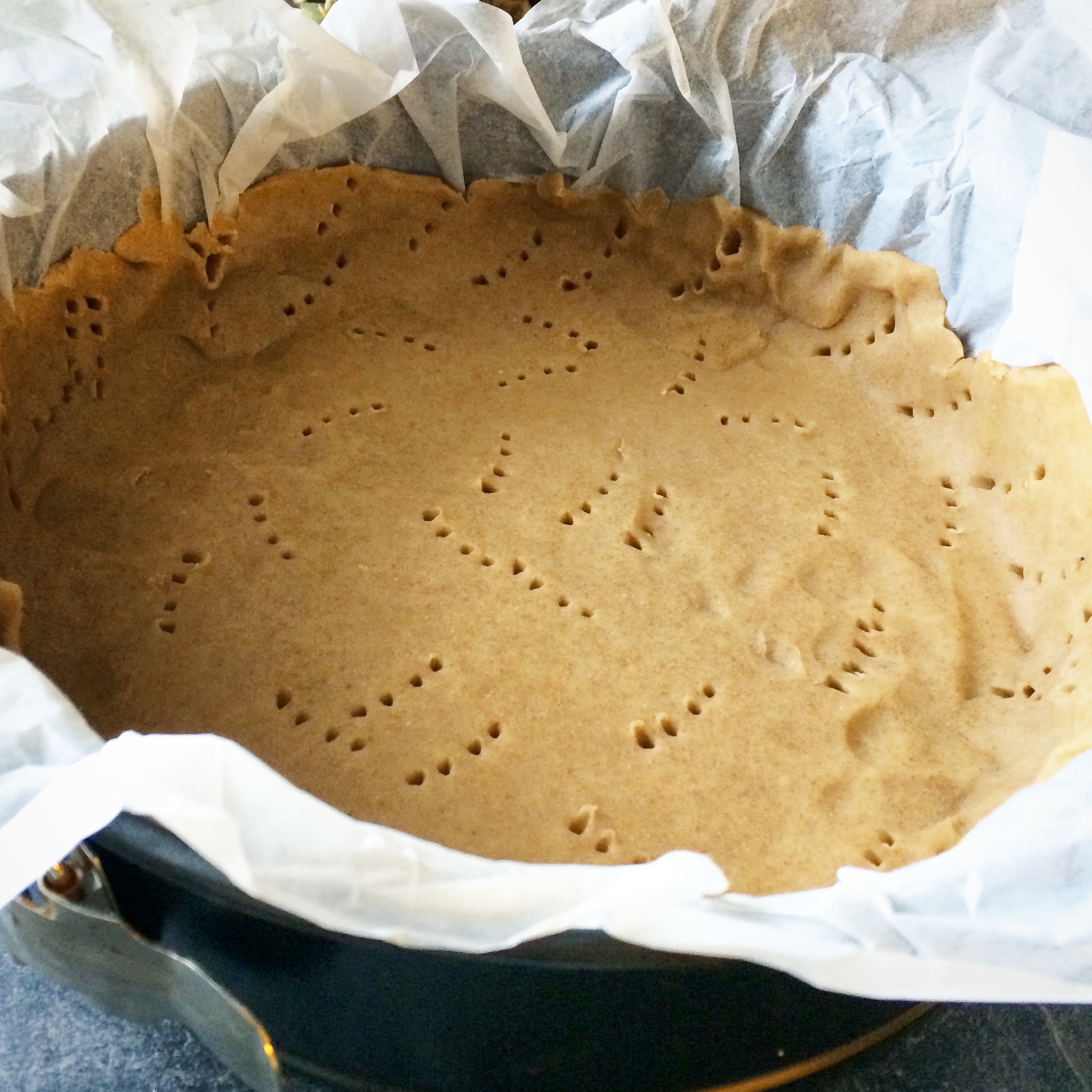 Trykk deigen ut i en paiform eller en springform med bakepapir. Prikk deigen med en gaffel og stek i 10 minutter på 200 grader.