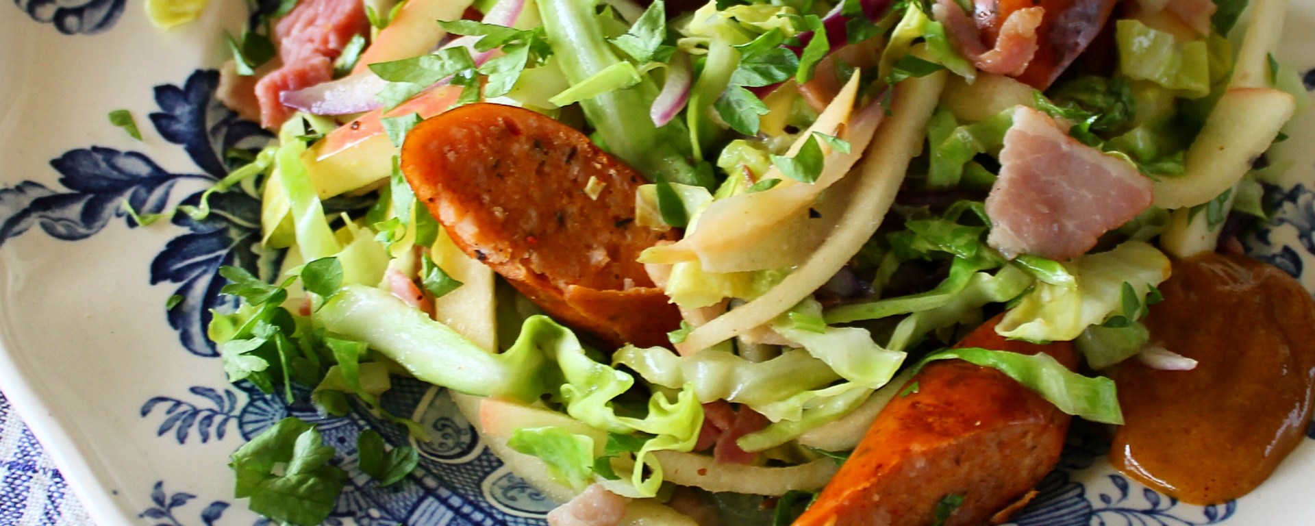 Grillet bratwurst med tilbehør av stekt bacon, surret spisskål, rødløk og eple med en frisk sennepsdressing er hverdagsmagi for meg. Pølse og skikkelig sennep er i seg selv veldig godt.