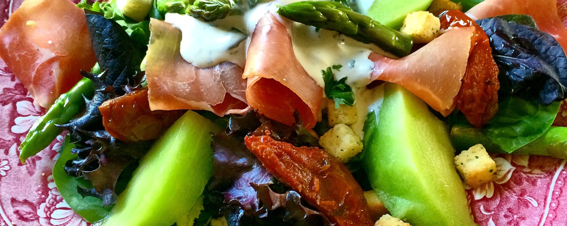 Anrett på tallerken ved å legge salat i bunnen. Fordel melon, asparges, soltørkede tomater og spekeskinke på tallerken. Topp med Saint Agur dressing og gjerne noen krutonger.