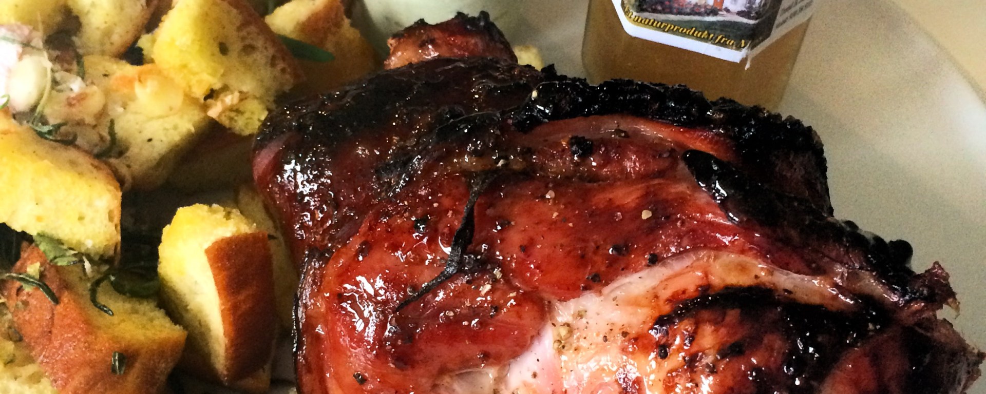 Sett knoken på bordet og la gjestene skjære selv. Topp med lyng honning, rømmedressing og sprøstekt loff med rosmarin og hvitløk.