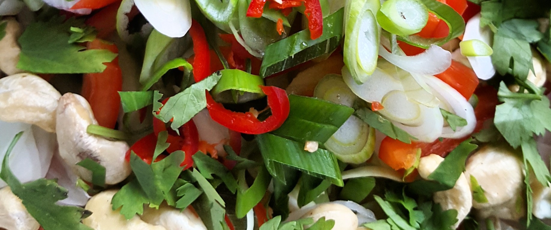 Strimle spisskålen, agurk, paprika, løk, vårløk og chili og ha i en stor bolle. Rist cashew nøttene i en panne eller kjøp de ferdig ristet. Ha cashew i salaten sammen med finklippet koriander. Du kan også ha nudler i salaten. Enten bråkoker du nudler i 3 minutter eller legger risnudler i lunkent vann i 10 minutter og blander inn i salaten.