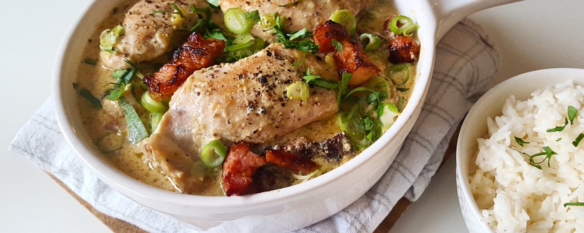 Tilsett 2 spiseskjeer smør i pannen. Salte og pepre kylling lårfiletene og legg de i pannen sammen finhakket hvitløksfedd. Brun kyllingen (i pannen sammen med baconet) på begge sider. Rør inn soyasaus, en terning hønsebuljong og en kartong med matfløte.