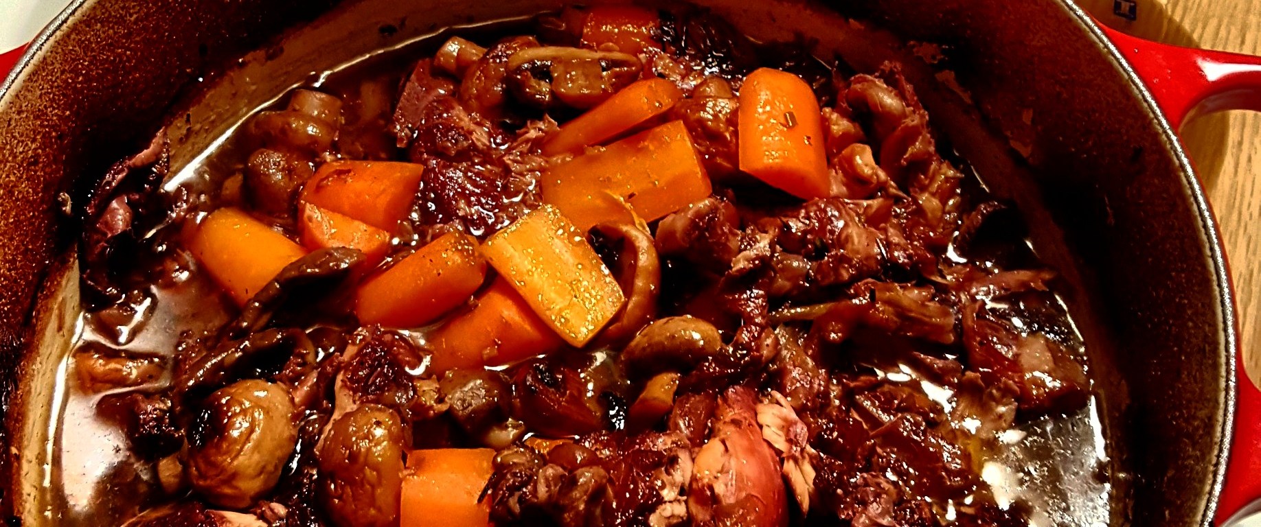 Det høres fancy ut og det smaker fancy, men egentlig er dette en super enkel langtidskokt hønsegryte. Litt fancy er den selvfølgelig fordi den er kokt i rødvin, men dette er egentlig bare skikkelig deilig fransk husmannskost. Alt du trenger å gjøre er å dele opp ingrediensene og legge de i gryta. Denne fantastiske gryten lager seg nesten selv.