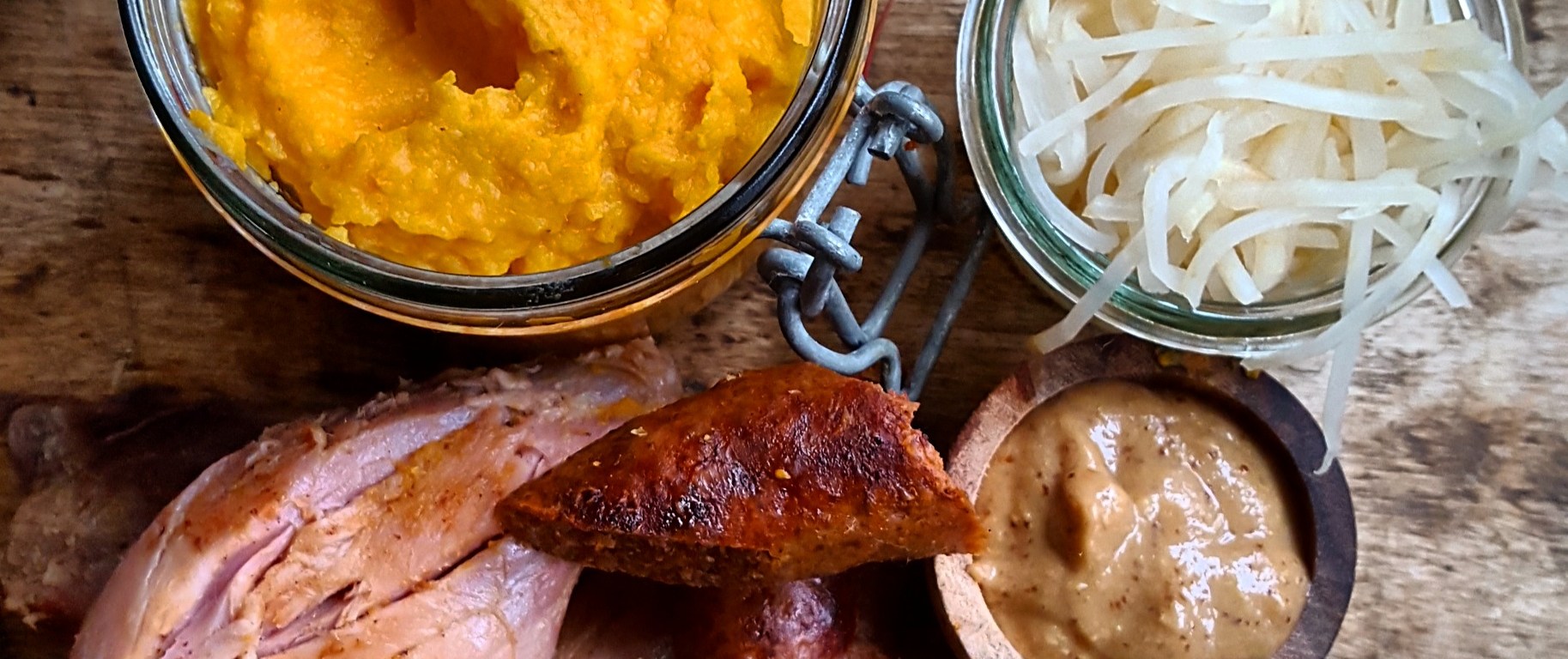 Jeg serverte søtpotetpurè til kokt svineknoke og pølser fra Pølseveven.