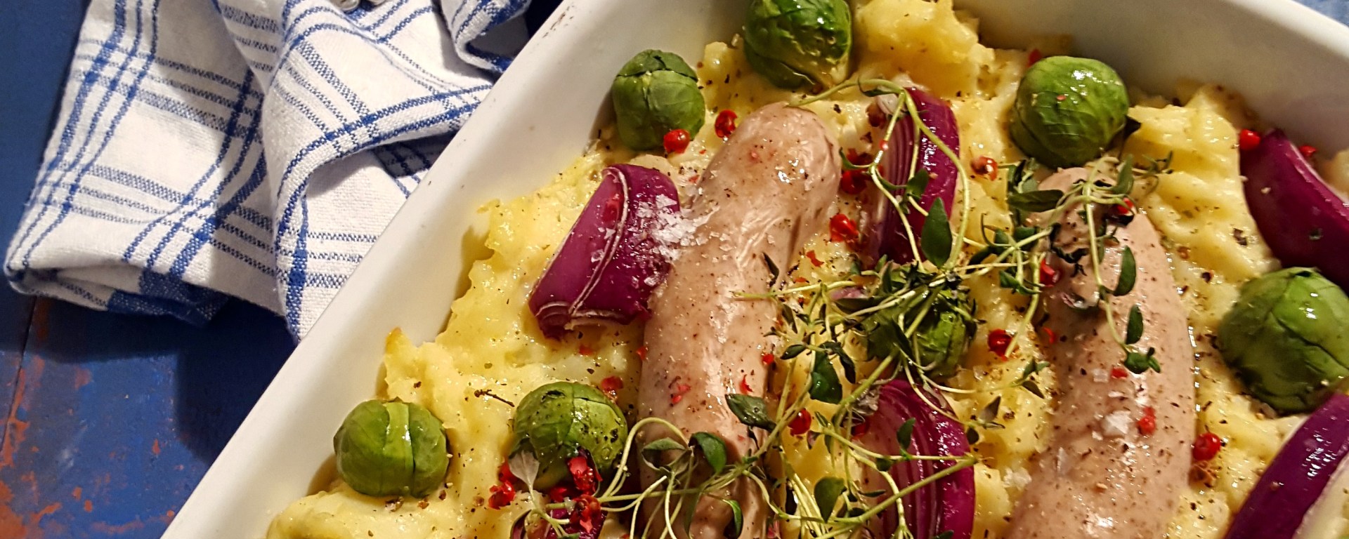 Dette er en super grateng å lage av rester etter julematen eller du kan lage den å servere i romjulen. Både store og små kommer til å digge denne måten å servere sossiser, rosenkål, løk og poteter på. Potetmos med muskat og deilig Pølseveven julesossiser med smeltet smør over. Lettvint og veldig godt!