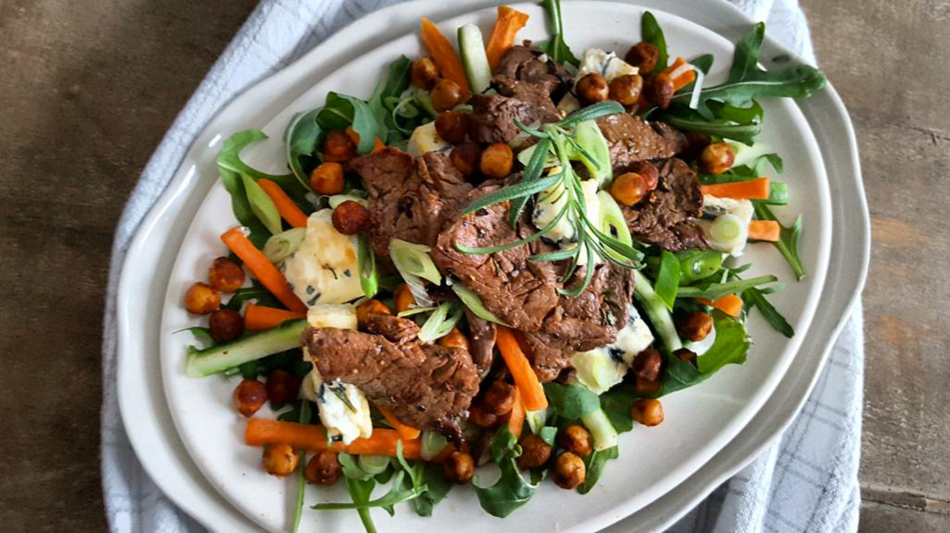 Legg opp salaten med ruccola i bunnen, så litt gulrot, agurk og vårløk. Strø noen kikerter over og legg på noen biter blåskimmelost. Avslutt med kjøttet på toppen. Du kan godt servere en rømmedressing til også.