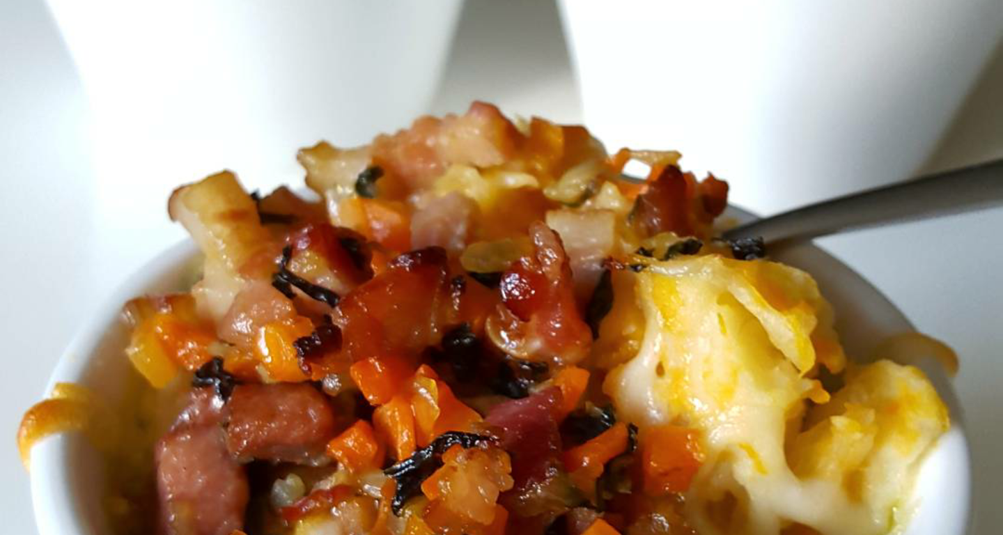 Jeg elsker klippfisk og jeg elsker poteter. Sammen er de dynamitt. Her har jeg laget en enkel potetmos, både av søtpotet og vanlig potet, trukket klippfisken, laget en topping med stekt bacon, gulrot, løk og spinat og gratinert det hele med mozzarella i ovnen.