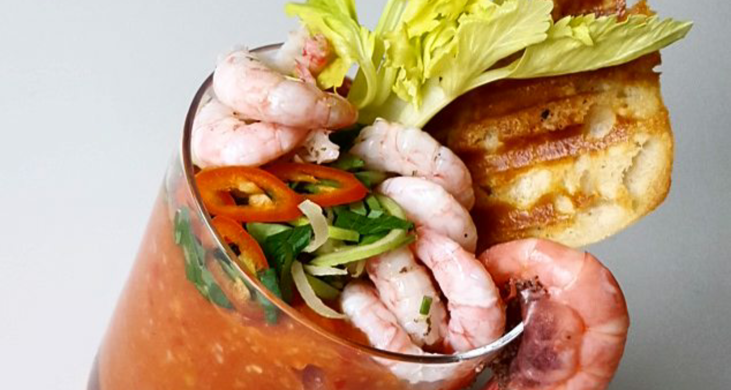 Jeg hadde gulrot og stangselleri fra jeg kokte kyllingkraft og hadde allerede planlagt å lage gazpacho, men det går fint å bruke rå også. Fjern frøene fra chilien og skrell gulrøttene. Ha alle ingrediensene i en foodmixer og kjør glatt. Smak til med salt og pepper. Gazpacho skal egentlig serveres med frisk basilikum som garnityr, men jeg hadde bare persille hjemme. Funket greit det også. Sett i kjøleskapet en halv time slik at smakene får satt seg. Hell gazpacho i glass og topp med ferske reker. Serveres med toast og en stilk stangselleri.