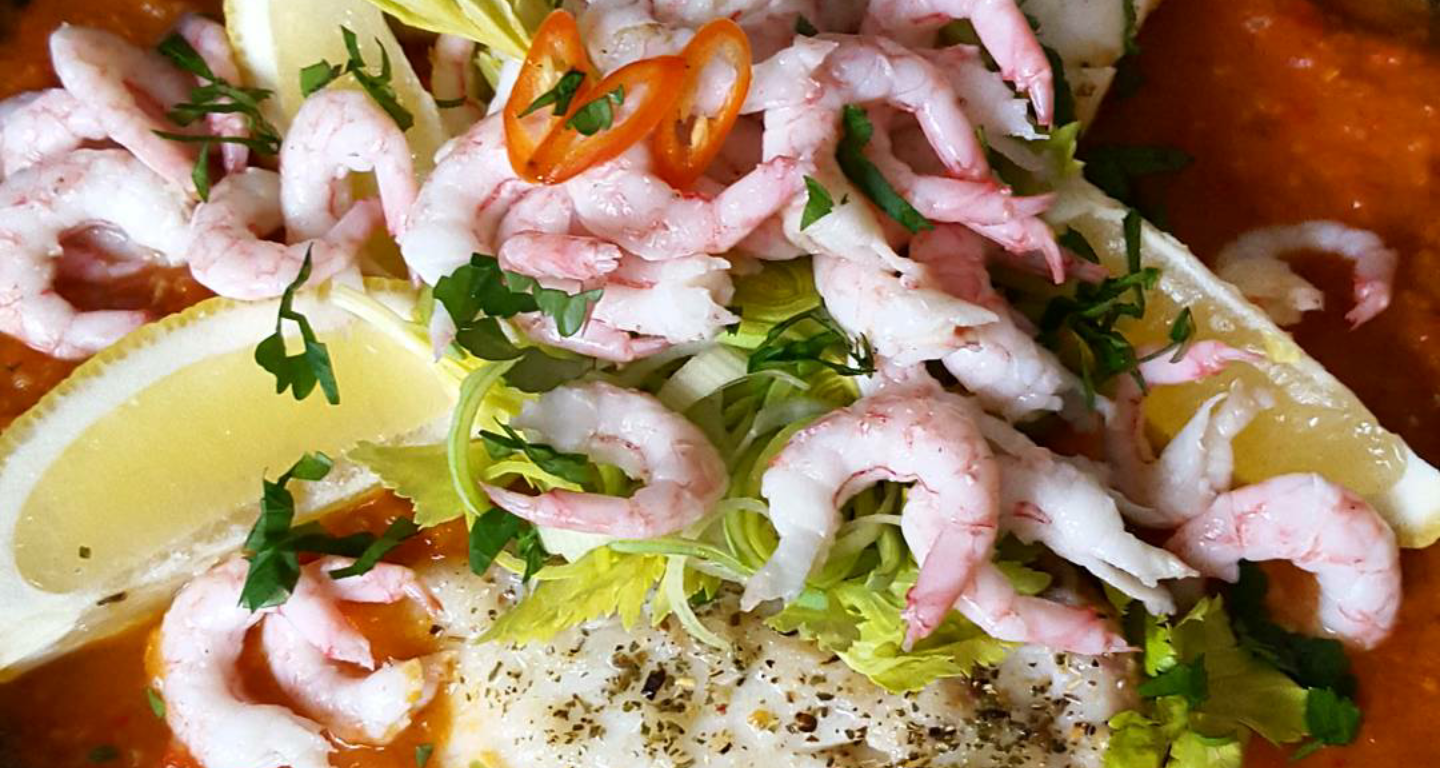 Smelt litt smør i stekepanna og stek fisken lett på den ene siden. Snu fisken over og smaksett med salt, pepper og sitronsaft. Hell gazpachoen rundt fisken i panna og la småkoke til fisken er ferdig og flaker seg. Topp med frisk stangselleri og ferske reker. Serveres gjerne med sitronbåter til.