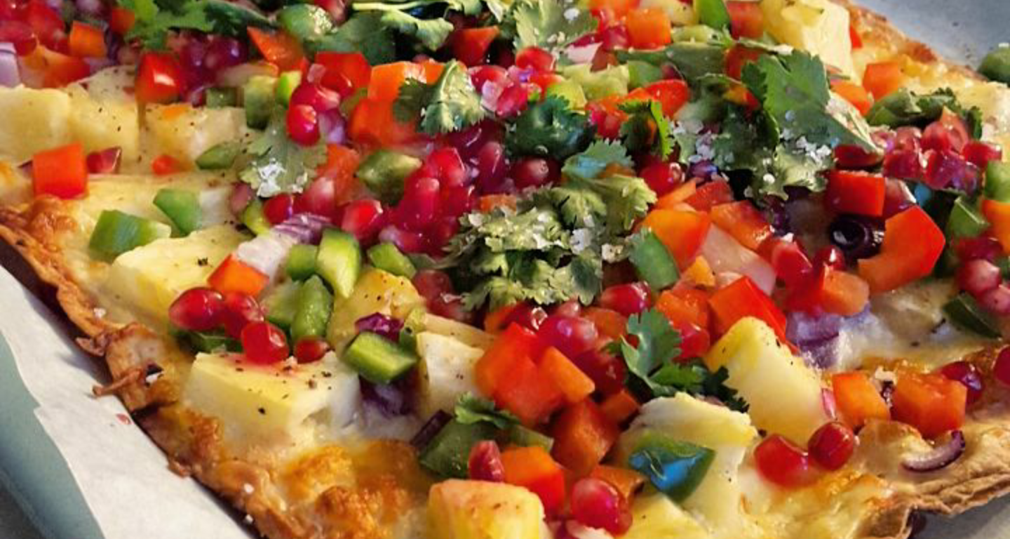 Lavash er tyrkiske og myke nanbrød som minner mye om tortilla, men de er lengre i formen. De brukes til wraps og tilbehør til annen mat. Jeg stekte lavash med creme fraiche, mozzarella, ananas og rødløk og toppet de med frisk paprika, koriander og granateple etterpå. Skjær i store biter, topp med creme fraiche og brett sammen.