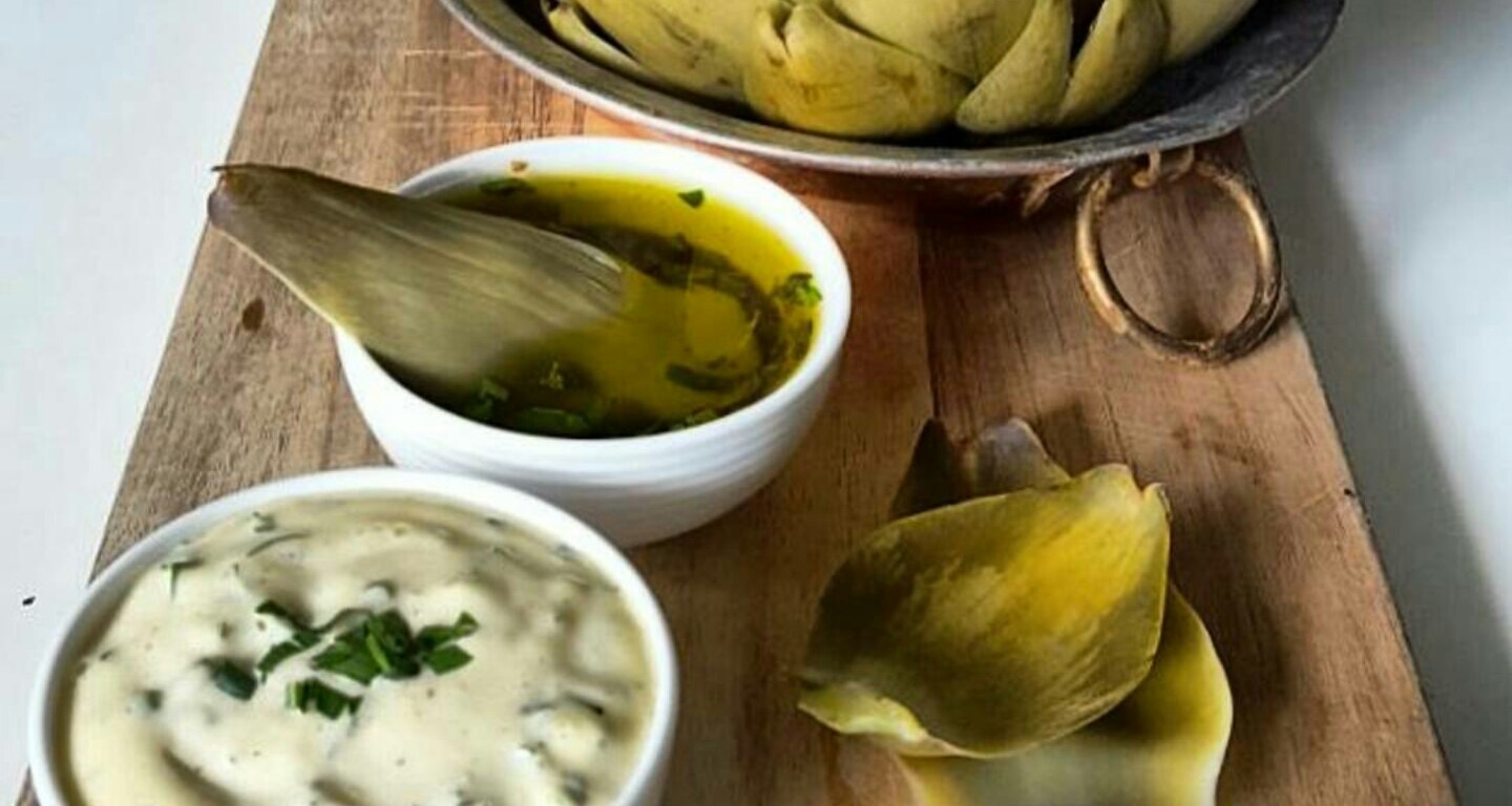 Server artisjokken hel. Riv av blader og dypp det i urteaioli og olje/eddikblandingen. Spis det myke kjøttet nederst på bladet og selveste artisjokkhjertet. Sunt og godt!