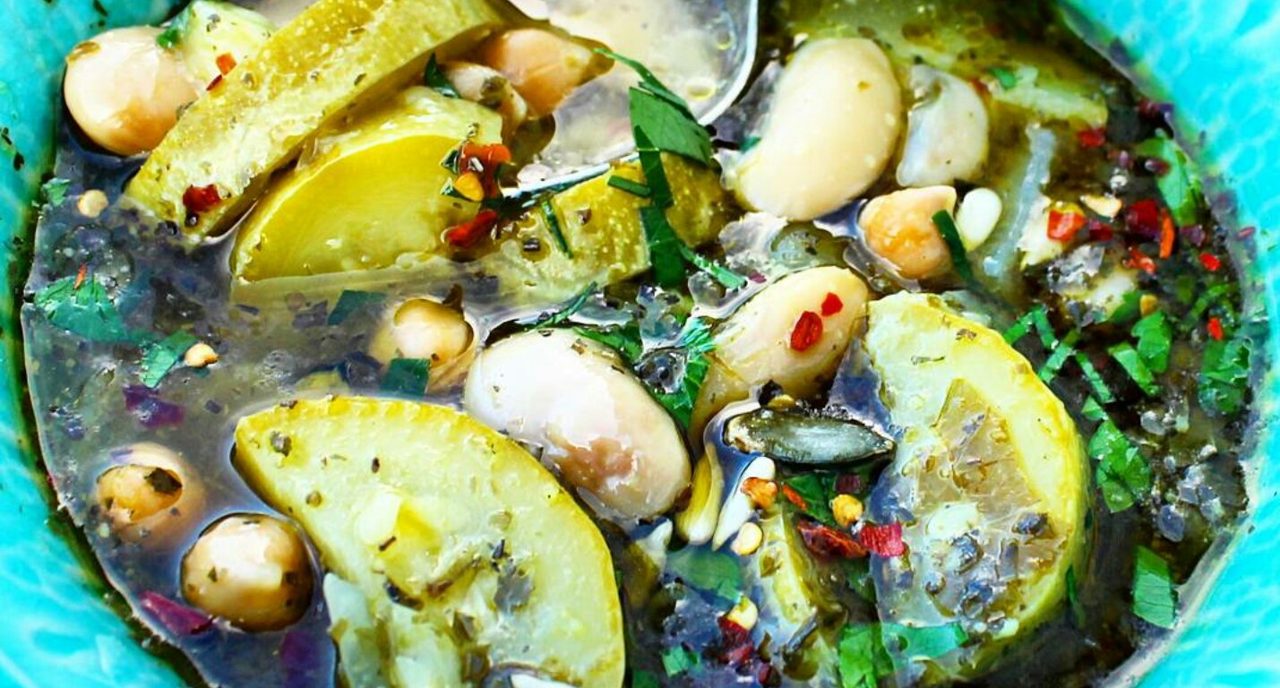 Varm en god olivenoljen i en stor kjele. Jeg bruker alltid oljen til Middelhavets Delikatesser på Røed Gård. Den tåler 220 grader og er utrolig fruktig og fin i smaken. Tilsett hvitløk og løk. La det surre i noen minutter før du har i squashen. Vend forsiktig inn persille og krydder. Hell i kraft/grønnsaksbuljong og la suppen småkoke i 10 minutter. Ha kikerter og bønner (eller linser) i suppen og la suppen småkoke i 10 minutter til. Rett føservering rører du inn eddik og smaker til med salt og pepper.