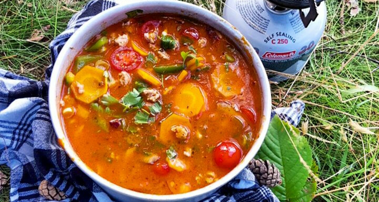 Denne suppen er strålende å servere på tur også. Finhakk grønnsakene hjemme og ta med i en pose. Hell hønsebuljong på termosen så går den enda raskere å tilberede på primusen.