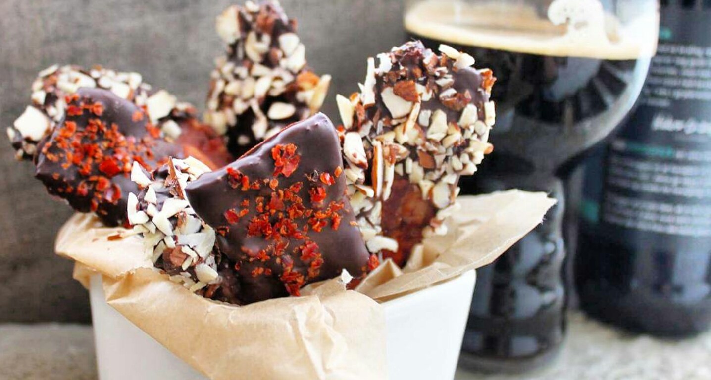 Vi snakker low carb og high fat! Vi snakker den ultimate snack for bacon og sjokoladelskere. Kombinasjonen sprøstekt og salt bacon sammen med mørk sjokolade duppet i mandelflak og chili sitter rett i sikringsboksen. Har du en hot date på Valentines er det dette sammen med en mørk porter du skal servere. Dette er skikkelig dudefood som viser vei til mannens hjerte via magen. Jeg er rimelig sikker på at dette funker på ei dame også! Server baconsnacks som forrett eller dessert. Det blir garantert suksess ❤