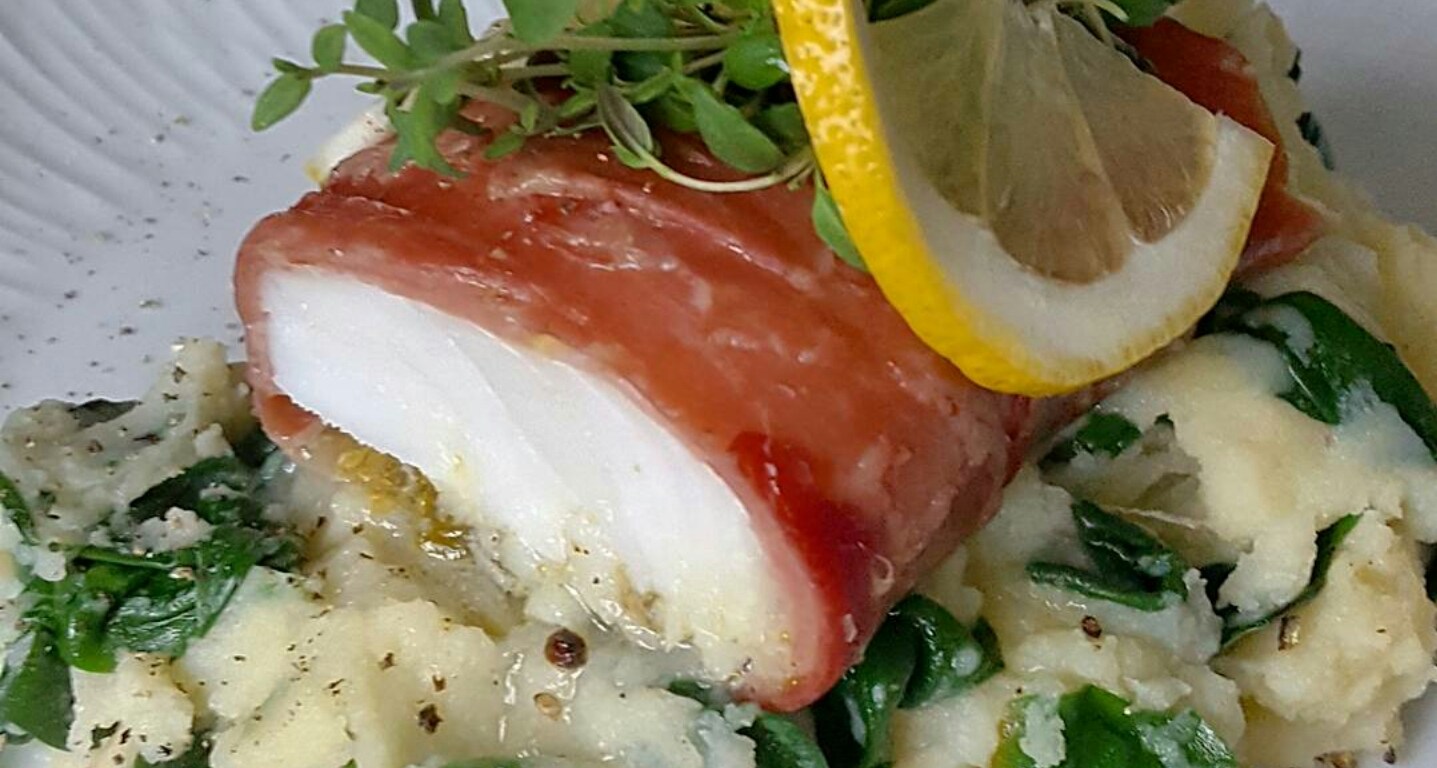 Kvern over litt pepper før du pakker parmaen over torsken.