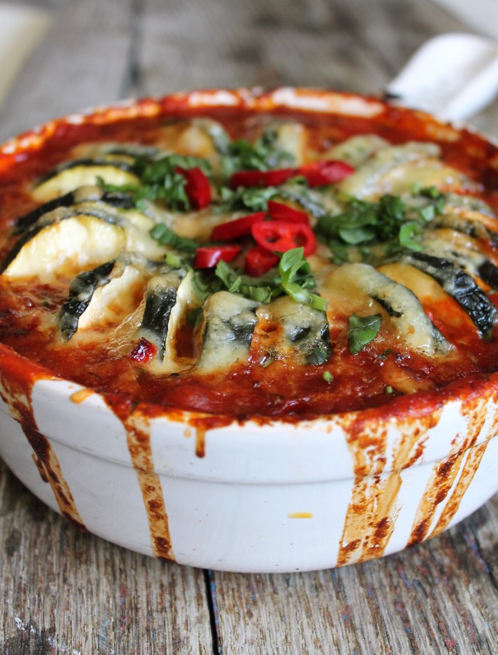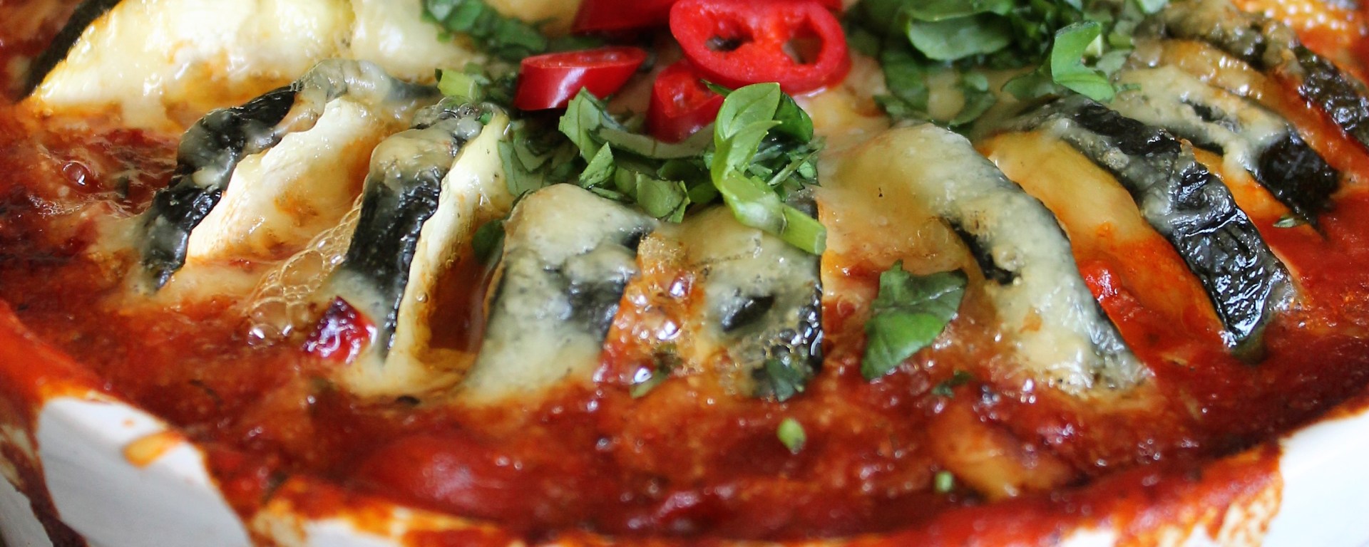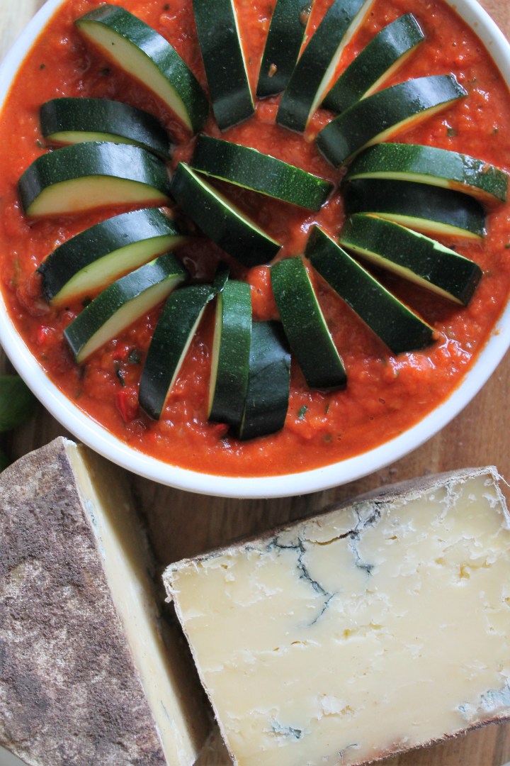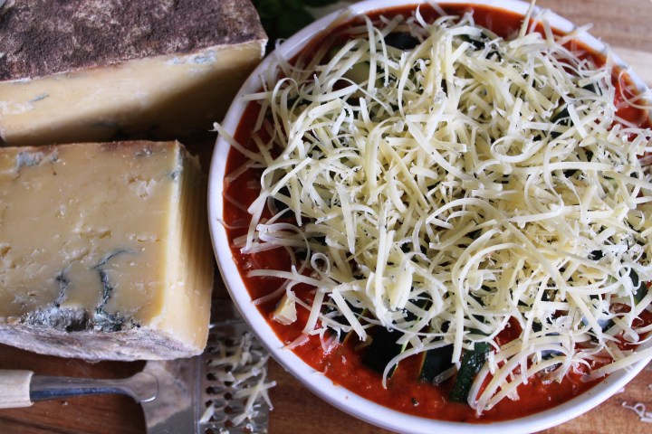 Jeg har tidligere blogget suppe laget på squash/zucchini som har overrasket meg med hvor mye smak denne grønnsaken egentlig har og hvilken god evne den har til å trekke til seg smak. Denne gratinerte squashen stekes i skiver sammen med en skikkelig deilig tomatsaus og en godt lagret cheddar. Tomatsausen lager du raskt ved å småkoke hvitløk, løk, chili, paprika, Mutti og basilikum i 5 minutter. Kjør den glatt med stavmikser og ha i en ildfast form. Skjær squashen i skiver og sett i tomatsausen. Riv over en skikkelig smakfull ost og gratiner i ovnen i 20 minutter. Cheddar er en vellagret fastost med mye smak som er perfekt å bruke i gratenger. Mitt valg av ost falt på «Cave aged cheddar» fra Somerset, England, som modnes i naturlige grotter. Ved å binde en klut på osten utvikles det muggflekker som en naturlig del av prosessen og gir den en litt blåskimmelaktig smak. Du kan bytte ut osten med mozzarella. Denne gratengen er perfekt hvis du ikke vil spise kjøtt eller den kan være tilbehør til koteletter og annet kjøtt.
