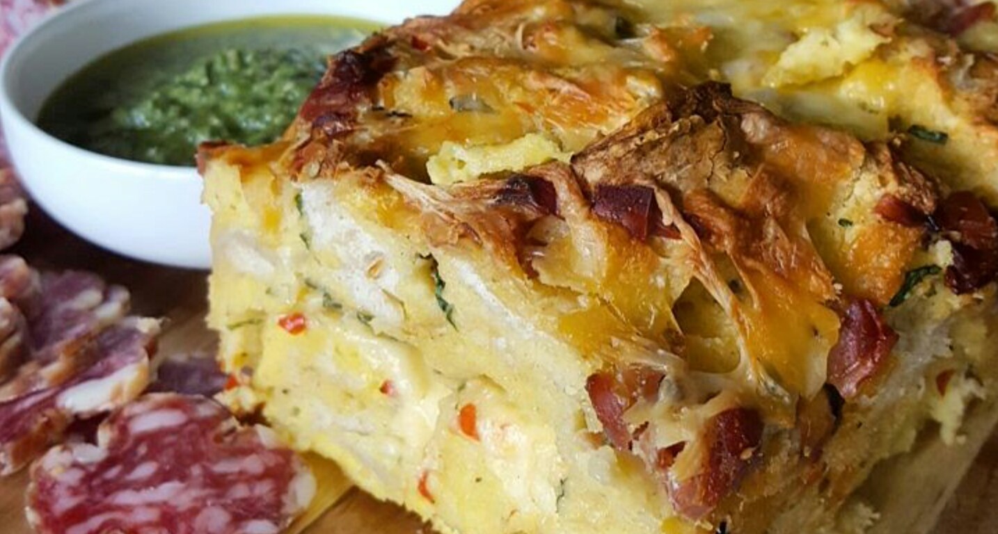 Dette er nøkkelen til suksess for enhver lunch eller koldtbord. Med denne fremgangsmåten kan absolutt alle lykkes med å servere rykende ferskt, smakfullt, høyt og «hjemmebakt» brød. Det aller beste med denne fremgangsmåten er at du setter det sammen dagen før, oppbevarer det i kjøleskapet over natten og steker det mens du dekker på til gjester dagen etter. Her tar du rett og slett og skjærer et kjøpabrød i terninger, legger det i form og heller over en eggeblanding med chili, hvitløk, persille, revet ost og strimlet spekeskinke. Over natten vil eggeblandingen trekke seg inn i brødet og når du tar det ut av ovnen ser det ut som et helt vanlig nystekt brød med masse deilig smak og snadder i. Så enkelt og så vanvittig smakfullt at du bør kanskje lage 2. Server gjerne med en pesto, litt spekemat og ovnsbakte tomater til. Dette brødet kommer til å gå som varmt hvetebrød.
