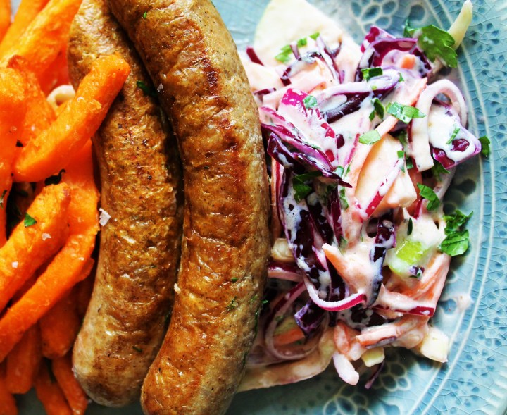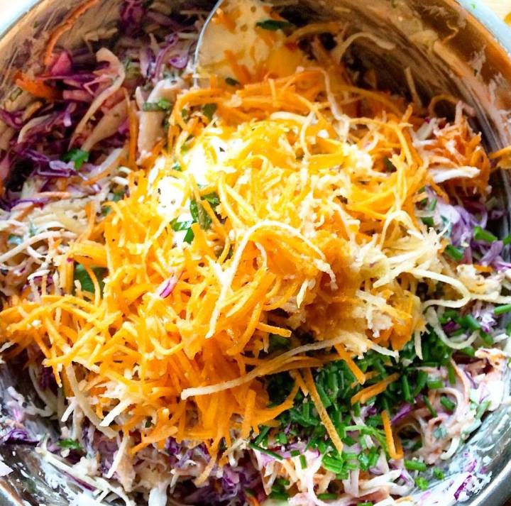 Jeg serverte coleslaw til Pølsevevens nye svinepølser med eple og fennikel. Dagen derpå ble coleslawen brukt i skikkelig snadder sandwicher. Italiensk salat fra Ertnes har vært en påleggsfavoritt hos meg siden jeg var liten, men denne varianten av coleslaw synes jeg bød på enda mer smak og virker lettere uten majones. Selv tenåringen som vanligvis ikke spiser slike salater forsynte seg godt.