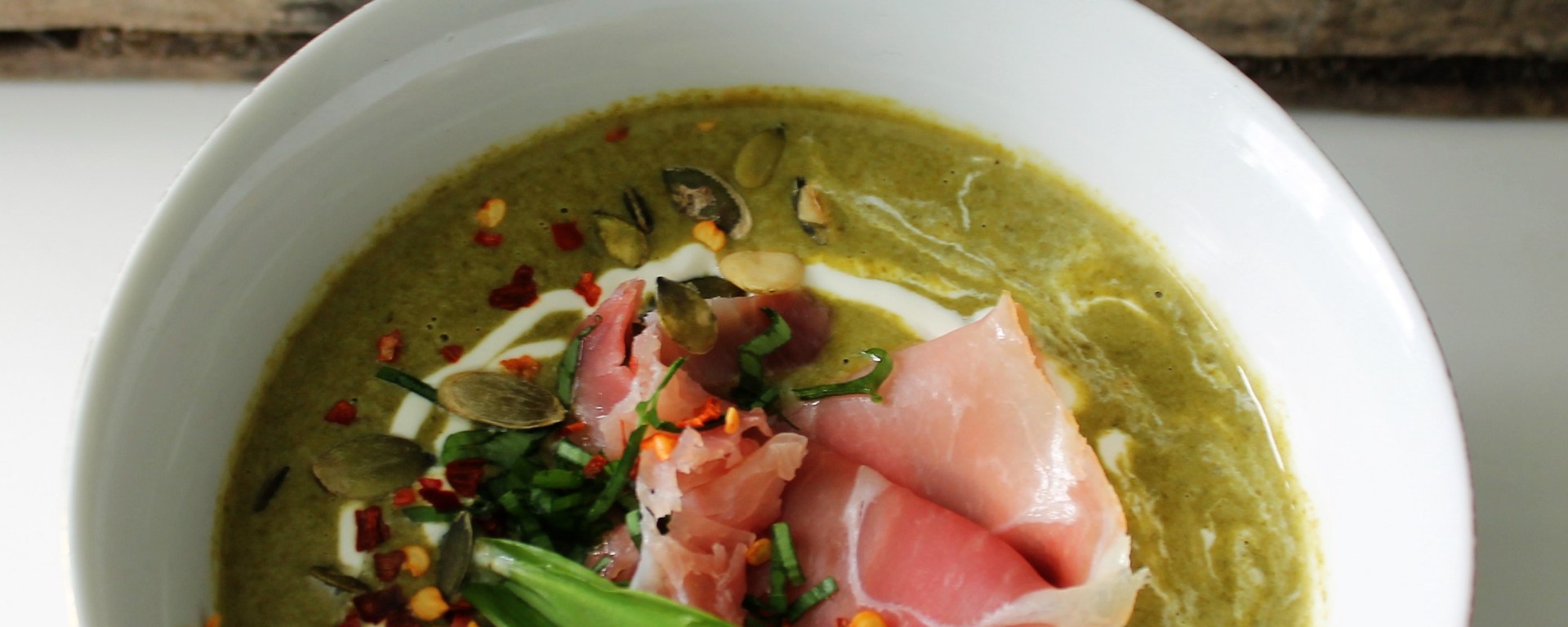 Jeg pimpet opp suppen med spekeskinke, gresskarkjerner, rømme og chiliflak.