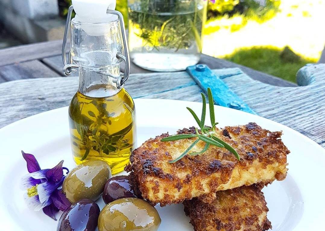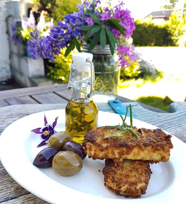 Server sprøstekt halloumi med oliven og urteolje. Det smaker også godt med aioli til.