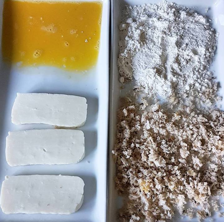 Vend halloumien først i mel, så i egg og til sist i brødsmulene. Legg halloumien forsiktig i oljen. La den ligge i 15-20 sekunder før du snur den over på andre siden. Her lønner det seg å stå å følge med. Er oljen for varm blir skorpen helt svart og svidd. Legg osten over på tørkepapir så den får dryppet av seg overskuddsoljen.