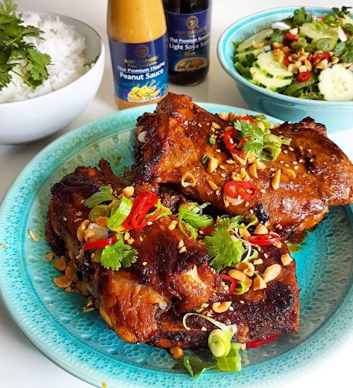 Noen ganger vet man allerede når man tar frem ingrediensene at «dette blir sinnsykt godt», og denne retten er virkelig en sånn gang!! I det jeg rører sammen marinaden og luktene av hvitløk, chili, ingefær, grønn curry (må ikke forveklses med karri) og spisskummen blander seg med friskpresset limejuice bare vet jeg at denne thai inspirerte marinaden kommer til å smake himmelsk. Så enkelt og så vanvittig godt! Jeg heller marinaden over kjøttfylte spareribs og setter i kjøleskapet. I mellomtiden koker jeg ris og snekrer sammen en salat med chili, peanøtter og frisk koriander. Mens spareribsen står i ovnen sprer de herligste dufter seg i huset. Jeg tar meg i å flere ganger gå å titte i ovnen.. Det var en sann fryd å sette tenenne i disse lekkerbiskene. Servert med jasminris, salat og peanøttsaus var dette virkelig et fantastisk måltid. Du kan velge å grille spareribs i stedet eller bruke annet type kjøtt. Kyllingfilet og svinefilet passer strålende til dette.