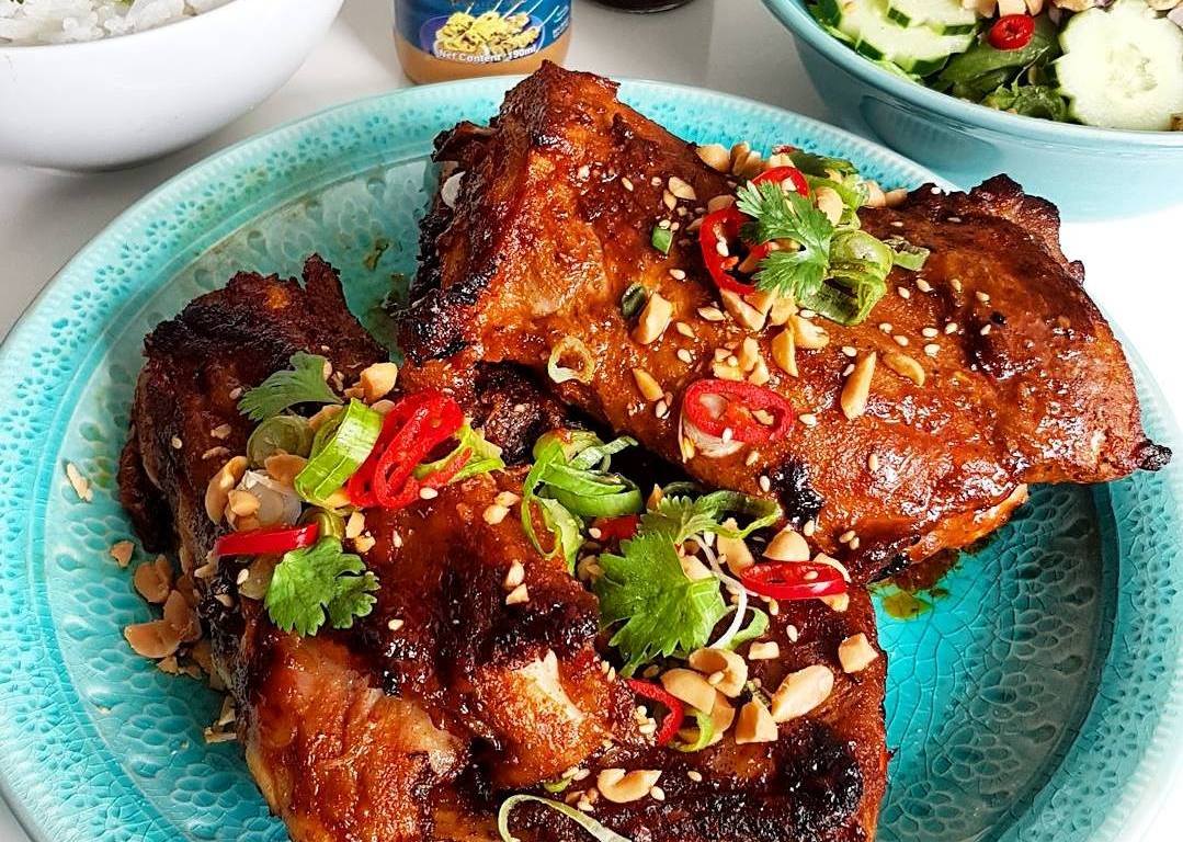 Noen ganger vet man allerede når man tar frem ingrediensene at «dette blir sinnsykt godt», og denne retten er virkelig en sånn gang!! I det jeg rører sammen marinaden og luktene av hvitløk, chili, ingefær, grønn curry (må ikke forveklses med karri) og spisskummen blander seg med friskpresset limejuice bare vet jeg at denne thai inspirerte marinaden kommer til å smake himmelsk. Så enkelt og så vanvittig godt! Jeg heller marinaden over kjøttfylte spareribs og setter i kjøleskapet. I mellomtiden koker jeg ris og snekrer sammen en salat med chili, peanøtter og frisk koriander. Mens spareribsen står i ovnen sprer de herligste dufter seg i huset. Jeg tar meg i å flere ganger gå å titte i ovnen.. Det var en sann fryd å sette tenenne i disse lekkerbiskene. Servert med jasminris, salat og peanøttsaus var dette virkelig et fantastisk måltid. Du kan velge å grille spareribs i stedet eller bruke annet type kjøtt. Kyllingfilet og svinefilet passer strålende til dette.