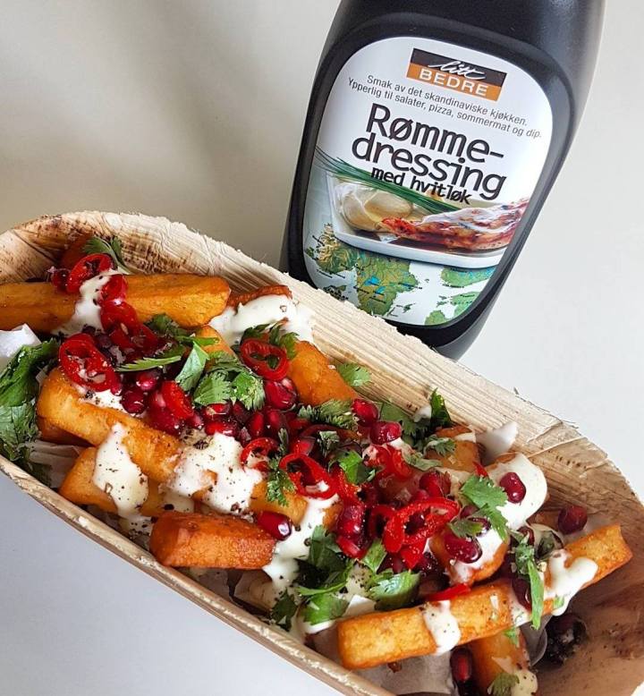 Server halloumifries i en skål toppet med rømmedressing, finskåret chli, frisk koriander og søte granateplekjerner. Snikgjest elsker dressingene fra Gourmet Compagniet i Råde. De er ikke bare «litt bedre», men mye bedre!