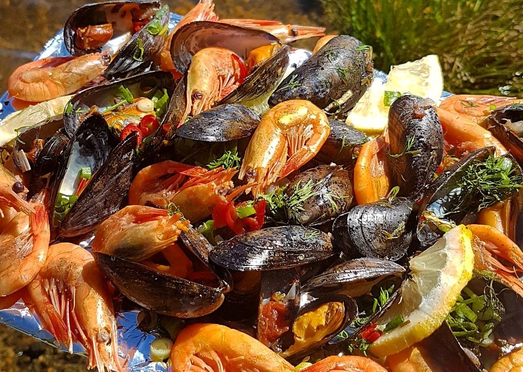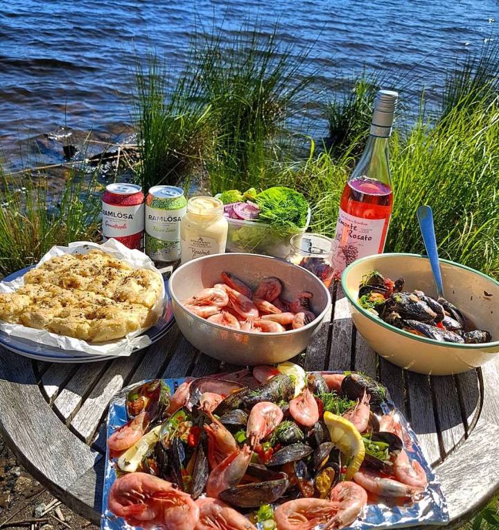 Røkte reker og blåskjell ble servert ved Vansjø og kan lett tilberedes på tur over primus og med en aburøk. Det smakte helt nydelig med nybakt foccacia, hvitløksaioli, salat, rødløk og dill til. Dette skal lages igjen denne sommeren.